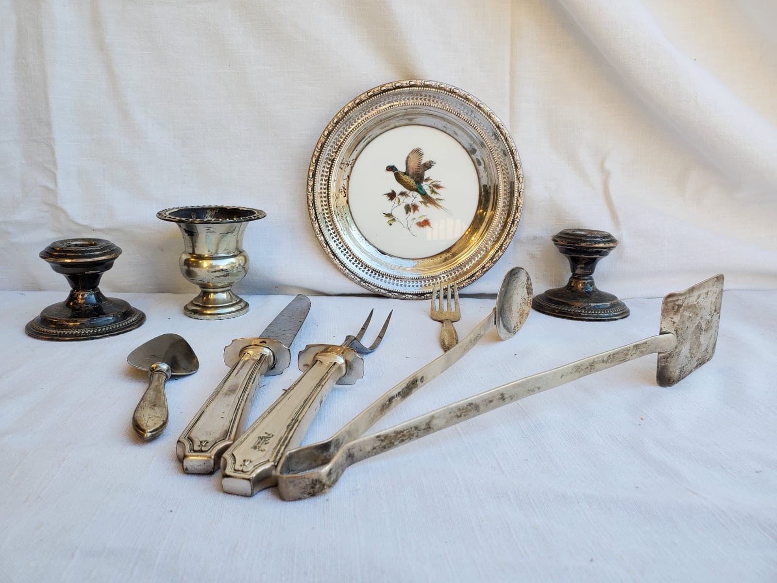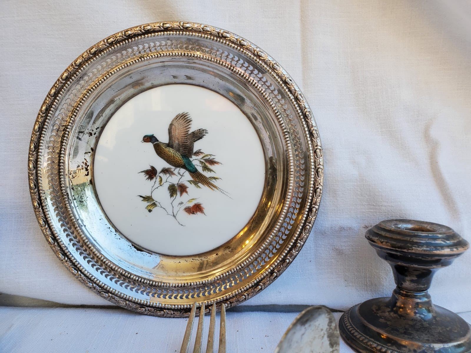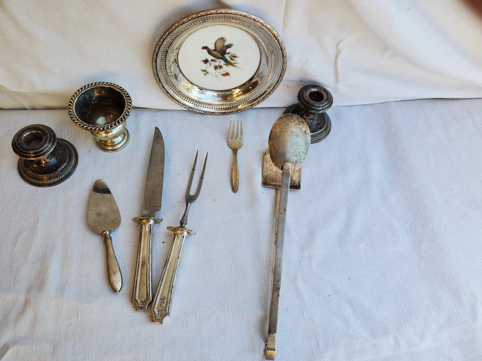 Vintage Sterling Silver Plate with Pheasant Bird, Candle Holders, and Serving Utensils A beautiful collection of vintage sterling silver.