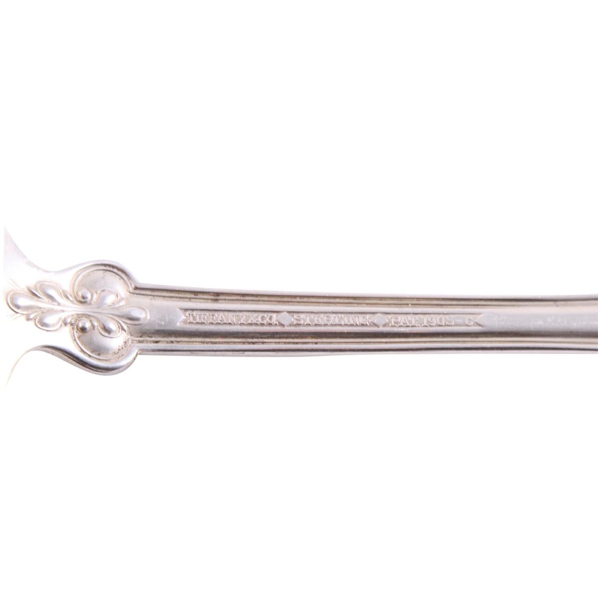 This is a Vintage Sterling Silver flatware set of 101 pieces by Tiffany & Co in the Shell & Thread pattern. This set consists of 12 Blunt Hollow Knives with TIFFANY blades, 9 1/8 inch- 9 Forks, 7 inch - 12 Salad Forks, 6 3/4 inch - 14 Teaspoons, 5 7/8 inch - 12 Place Oval Soup Spoons, 7 1/8 inch - 12 Flat Handle Butter Spreaders, 5 3/4 inch - 11 Iced Tea Spoons, 7 1/2 inch - 12 Demitasse Spoons, 4 1/8 inch - 3 Serving Tablespoons, 8 5/8 inch - 1 Gravy Ladle, 7 1/4 inch - 1 Blunt Hollow Butter Knife, 6 inch - 1 Cold Meat Serving Fork, 9 inch - 1 Roast Carving Fork, 11 inch. Includes new Mahogany storage chest. Monogrammed in lovely period script. This flatware set is in very good estate condition.