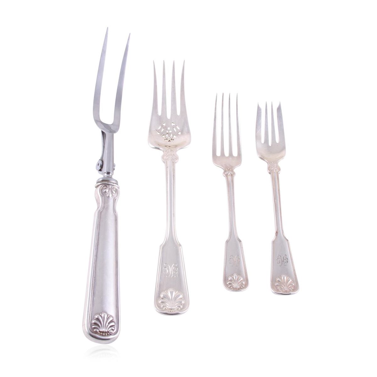 This is a Vintage Sterling Silver flatware set of 101 pieces by Tiffany & Co in the Shell & Thread pattern. This set consists of 12 Blunt Hollow Knives with TIFFANY blades, 9 1/8 inch- 9 Forks, 7 inch - 12 Salad Forks, 6 3/4 inch - 14 Teaspoons, 5 7/8 inch - 12 Place Oval Soup Spoons, 7 1/8 inch - 12 Flat Handle Butter Spreaders, 5 3/4 inch - 11 Iced Tea Spoons, 7 1/2 inch - 12 Demitasse Spoons, 4 1/8 inch - 3 Serving Tablespoons, 8 5/8 inch - 1 Gravy Ladle, 7 1/4 inch - 1 Blunt Hollow Butter Knife, 6 inch - 1 Cold Meat Serving Fork, 9 inch - 1 Roast Carving Fork, 11 inch. Includes new Mahogany storage chest. Monogrammed in lovely period script. This flatware set is in very good estate condition.