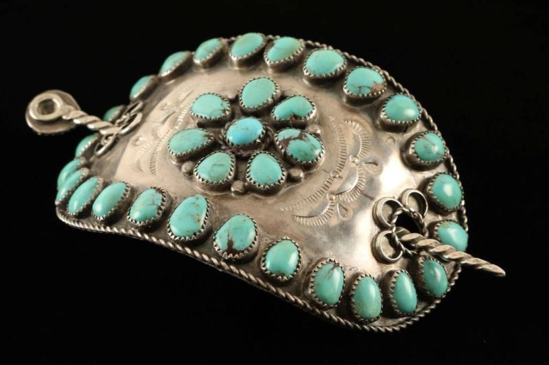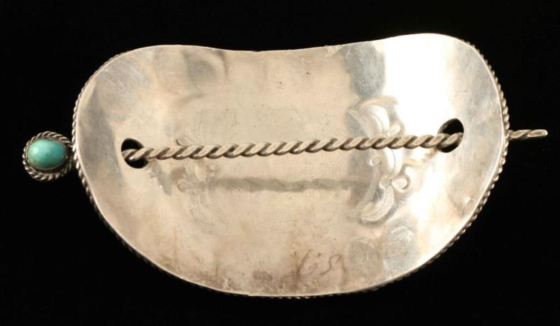 Large silver oval of turquoise with 25 small oval cabs of turquoise on the edge. Flower of 8 stones in the center of barrette. Hair pin is twisted silver with a turquoise stone at the end. Measures 2 3/4"x5". Signed 'ST'.