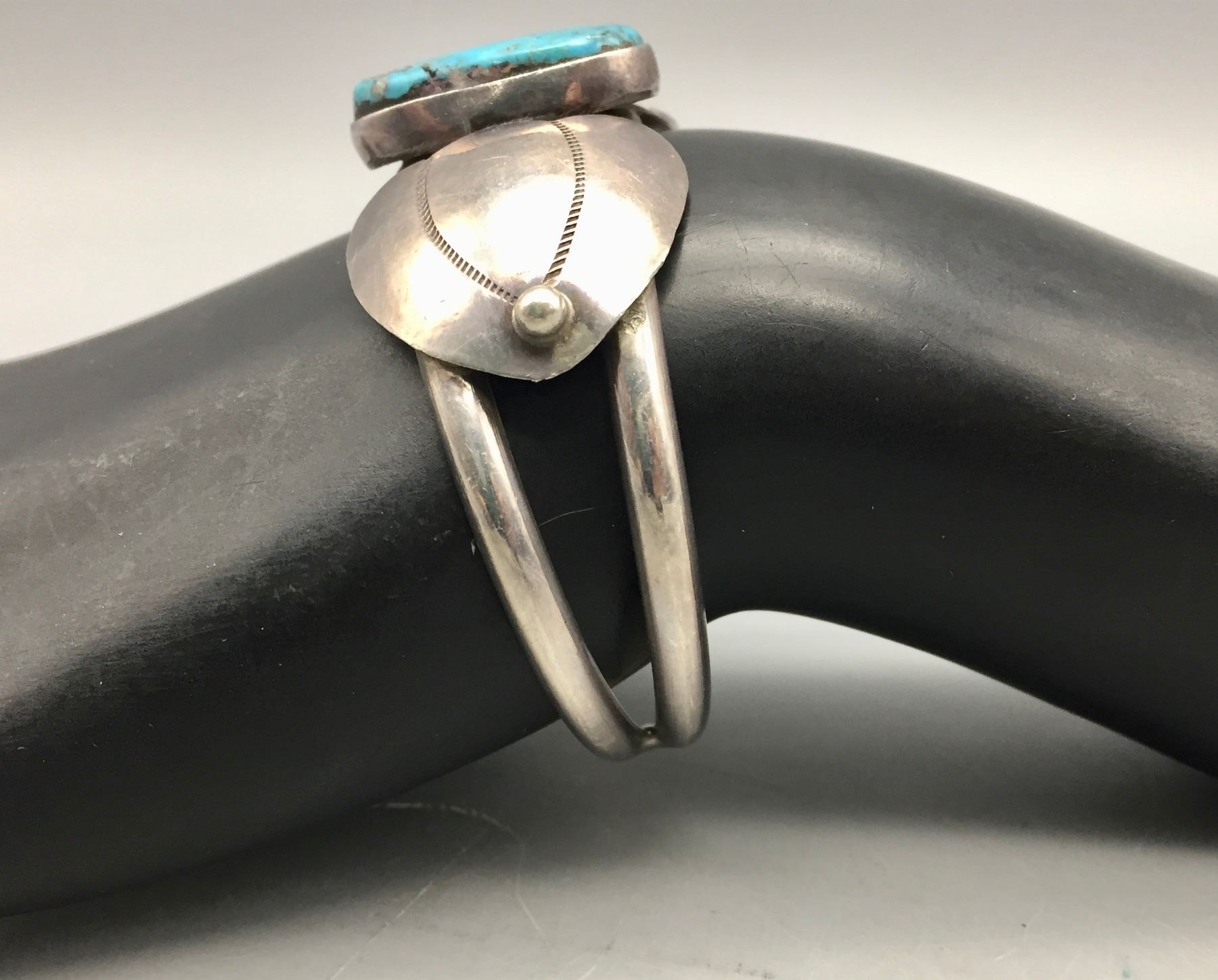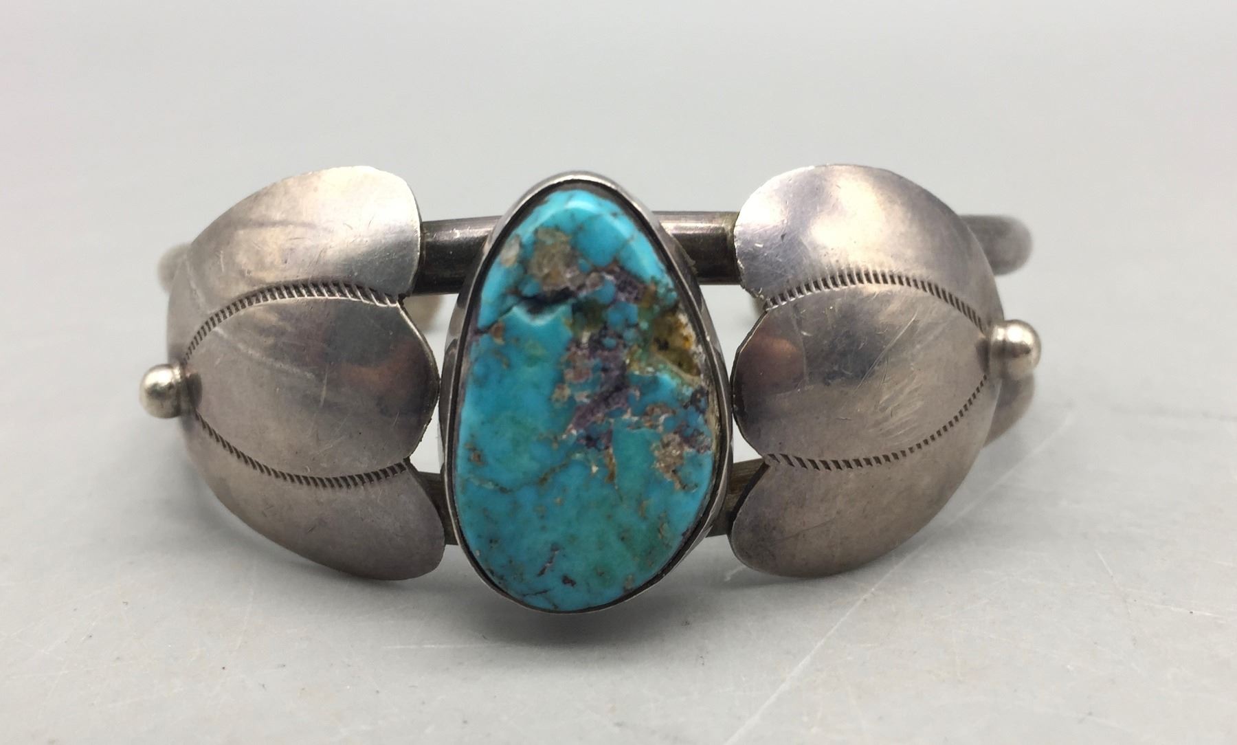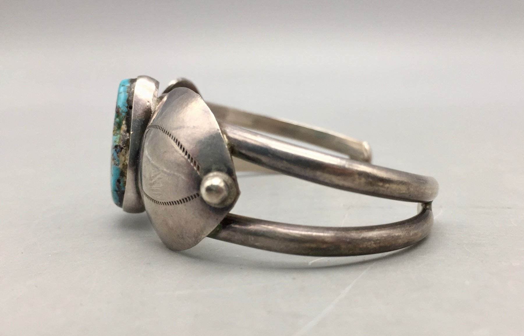 Size: Measures 5-3/8" with a 1-1/8" opening (fits a 6-1/2" wrist). Measures 1" wide and weighs 29.3 grans. Condition: Pretty good for its age, normal wear expected. The turquoise cabochon appears to have damage to one side of it.