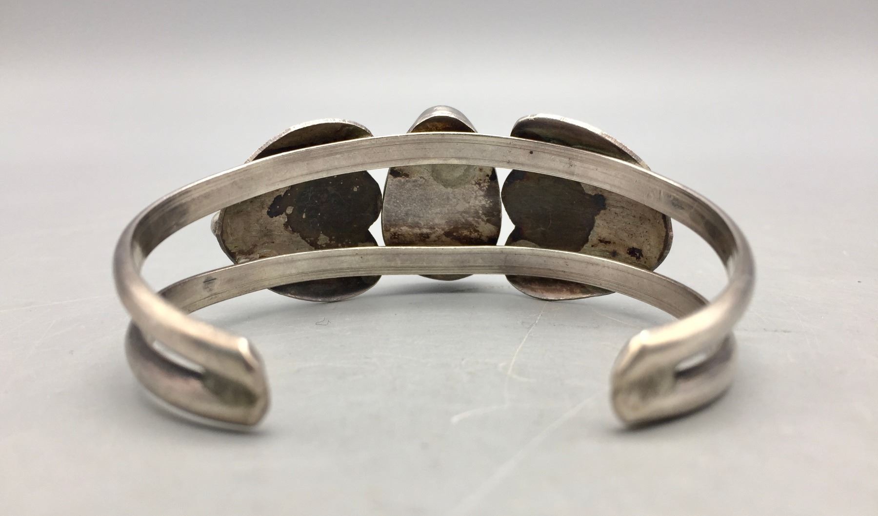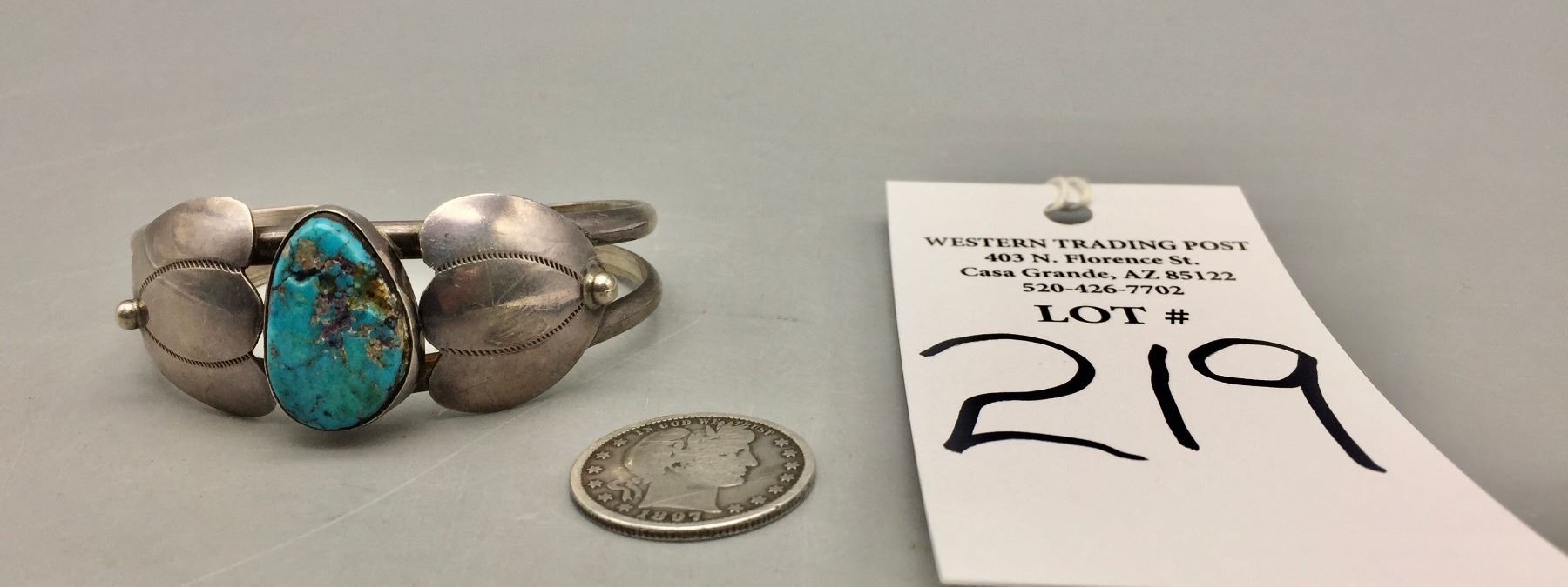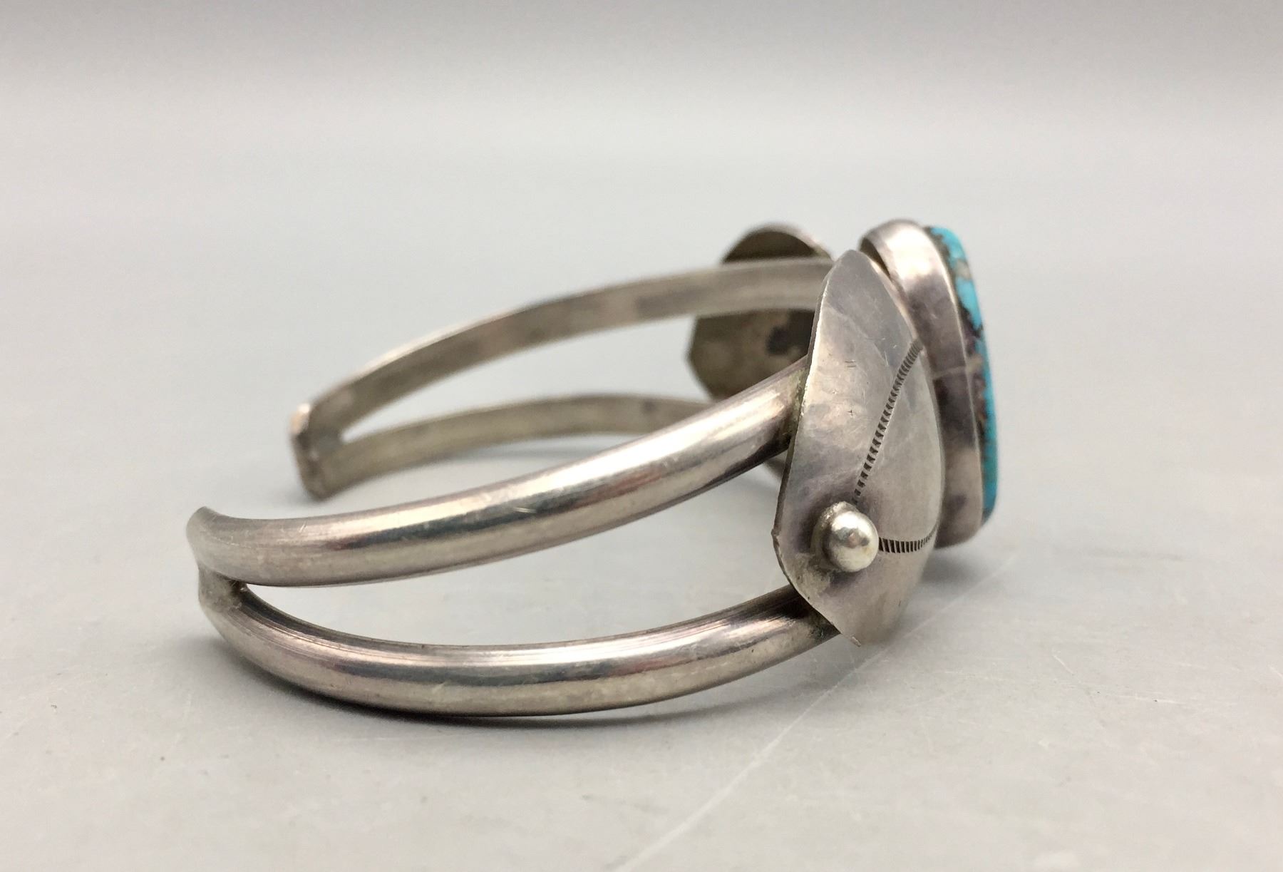 Size: Measures 5-3/8" with a 1-1/8" opening (fits a 6-1/2" wrist). Measures 1" wide and weighs 29.3 grans. Condition: Pretty good for its age, normal wear expected. The turquoise cabochon appears to have damage to one side of it.