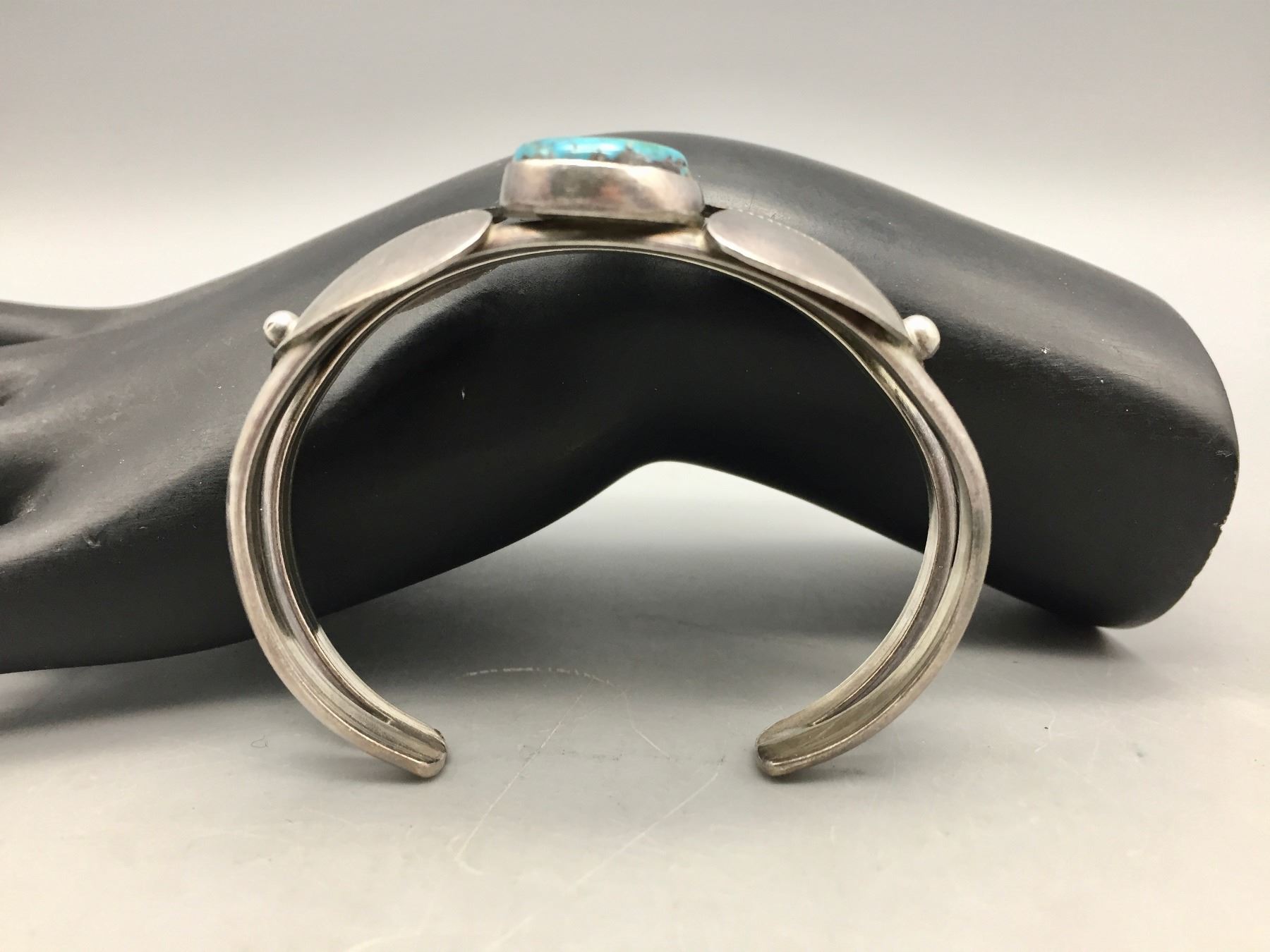 Description: Offered in this lot is a vintage sterling silver cuff bracelet featuring a single turquoise cabochon. Maker: No Hallmark.