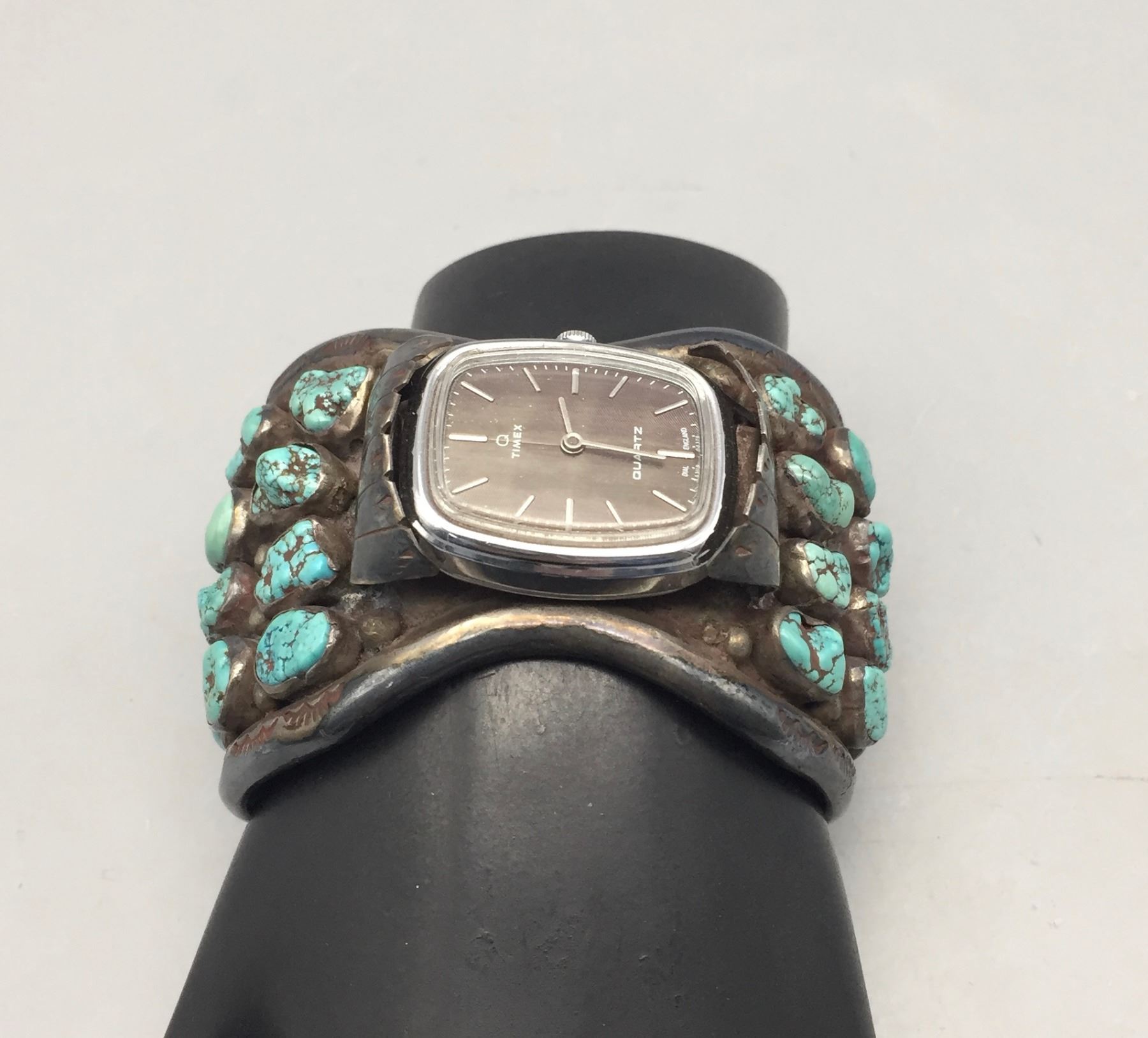 Description: Offered for sale in this lot is a vintage cluster style turquoise and sterling silver watch bracelet featuring nugget style turquoise cabochons. Maker: Unknown. Approx. Age: Vintage. Size: Measures 5-5/8” with a 1-1/2” opening, (fits a 7-1/8” wrist). Measures approx. 2” wide at widest point. Weighs 156.3 grams. Condition: Good for its age, normal wear expected. Please look closely at the pictures - they are an important part of our description. Shipping: There will be a $5 handling / packaging fee for shipping this lot. The actual cost of postage will be added on top of that.