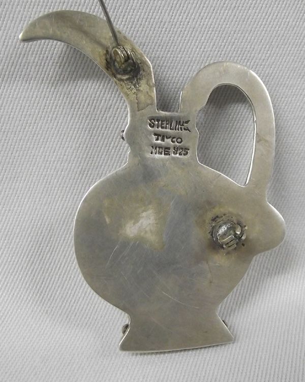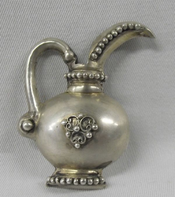 Vintage Sterling Taxco Pin, Signed. Large dimensional sterling pin in the shape of a handled ewer, enhanced with silver beads and a central wire-work design. Measures 1.25'' high x 1.75'' wide with a depth of 1/2''. It is stamped ''Sterling'' ''Taxco'' ''MGE 925''.