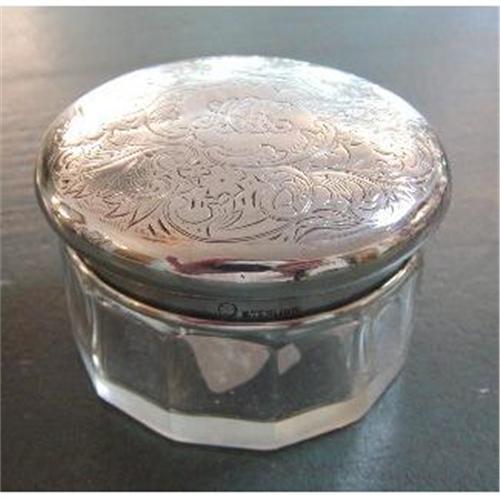 Beautiful sterling silver and glass powder jar. Top is in beautiful clean condition, with great engraved detail and 3 initials which I can't make out (sorry). It does have some very minor dents, as is usual with these old pieces, nevertheless, it's still beautiful. The glass jar is in great condition, no chips/nicks, very clean piece.