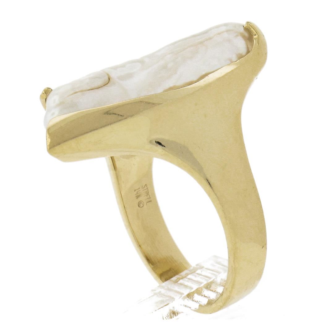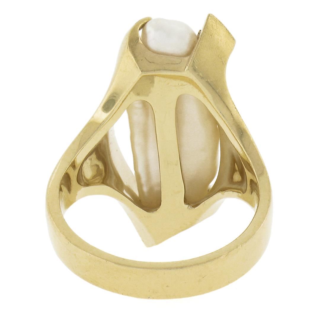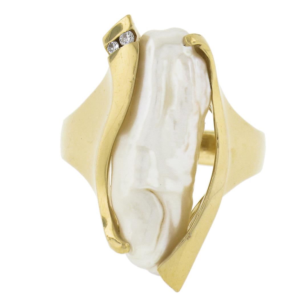 A vintage solid 14k yellow gold free form ring by Sterllman, with 1 baroque shape cultured pearl (22.5x7.5mm), and round cut natural diamonds. The ring is size 7.0, weighs a total of 9.85 grams, and measures 25.5mm wide.
