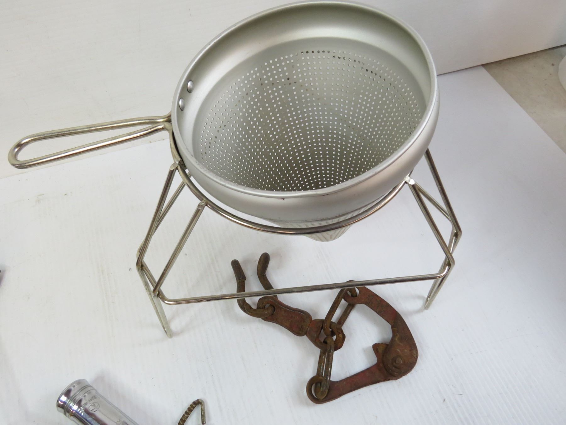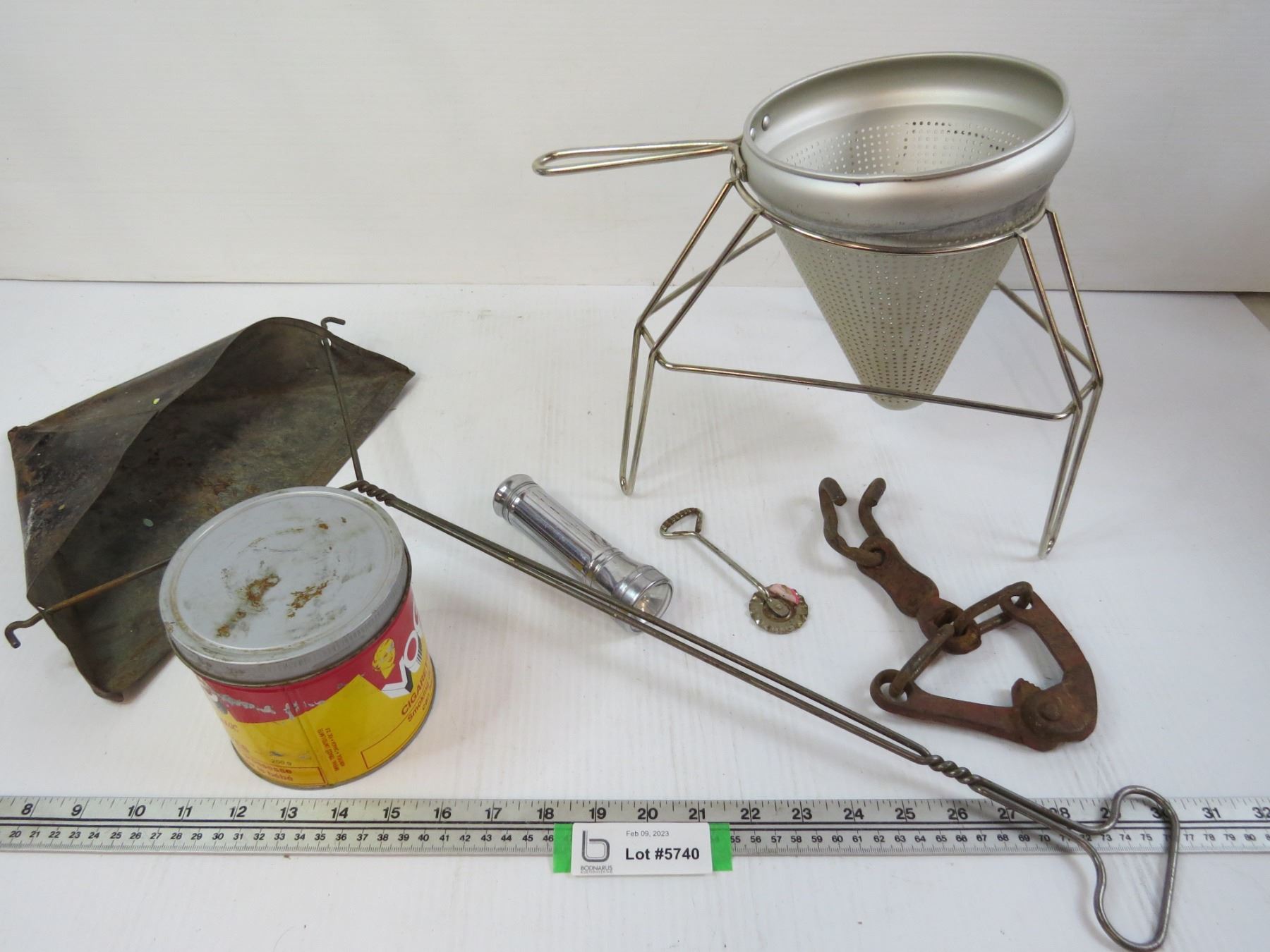 Vintage Strainer - Flashlight - Dustpan - Pastry Cutter - Tabbacco Tin - Clamp