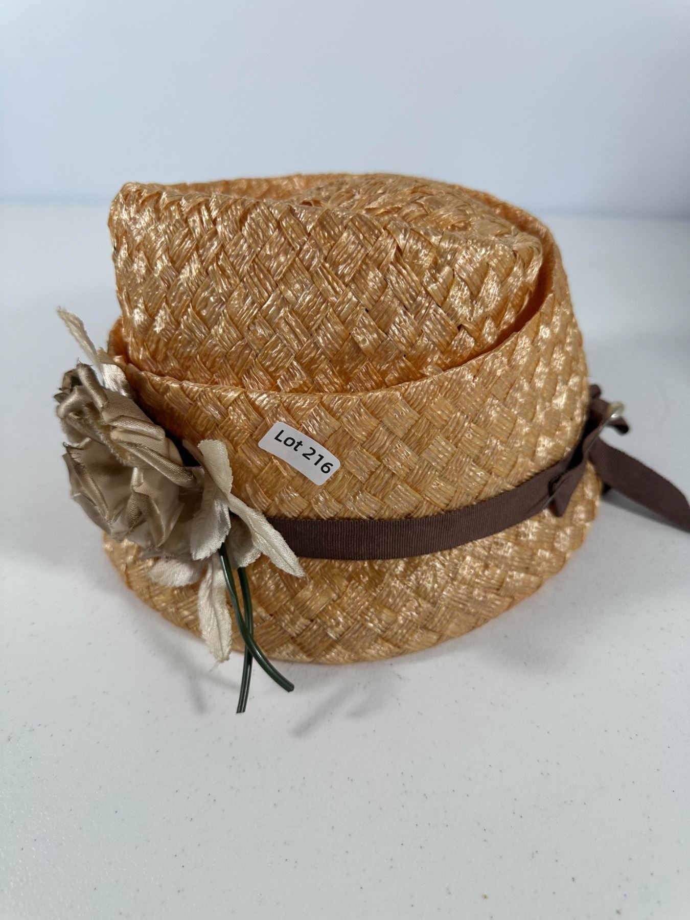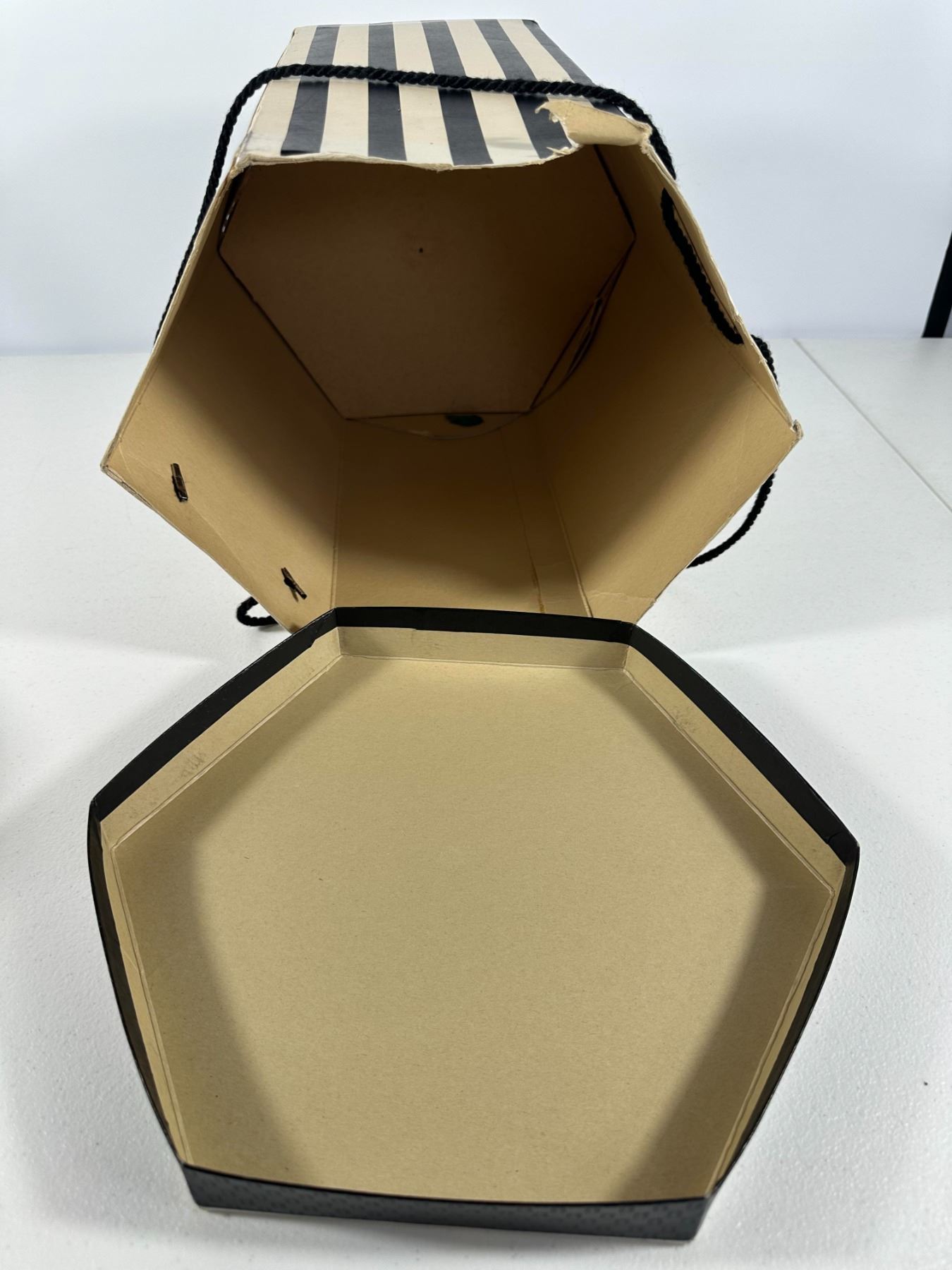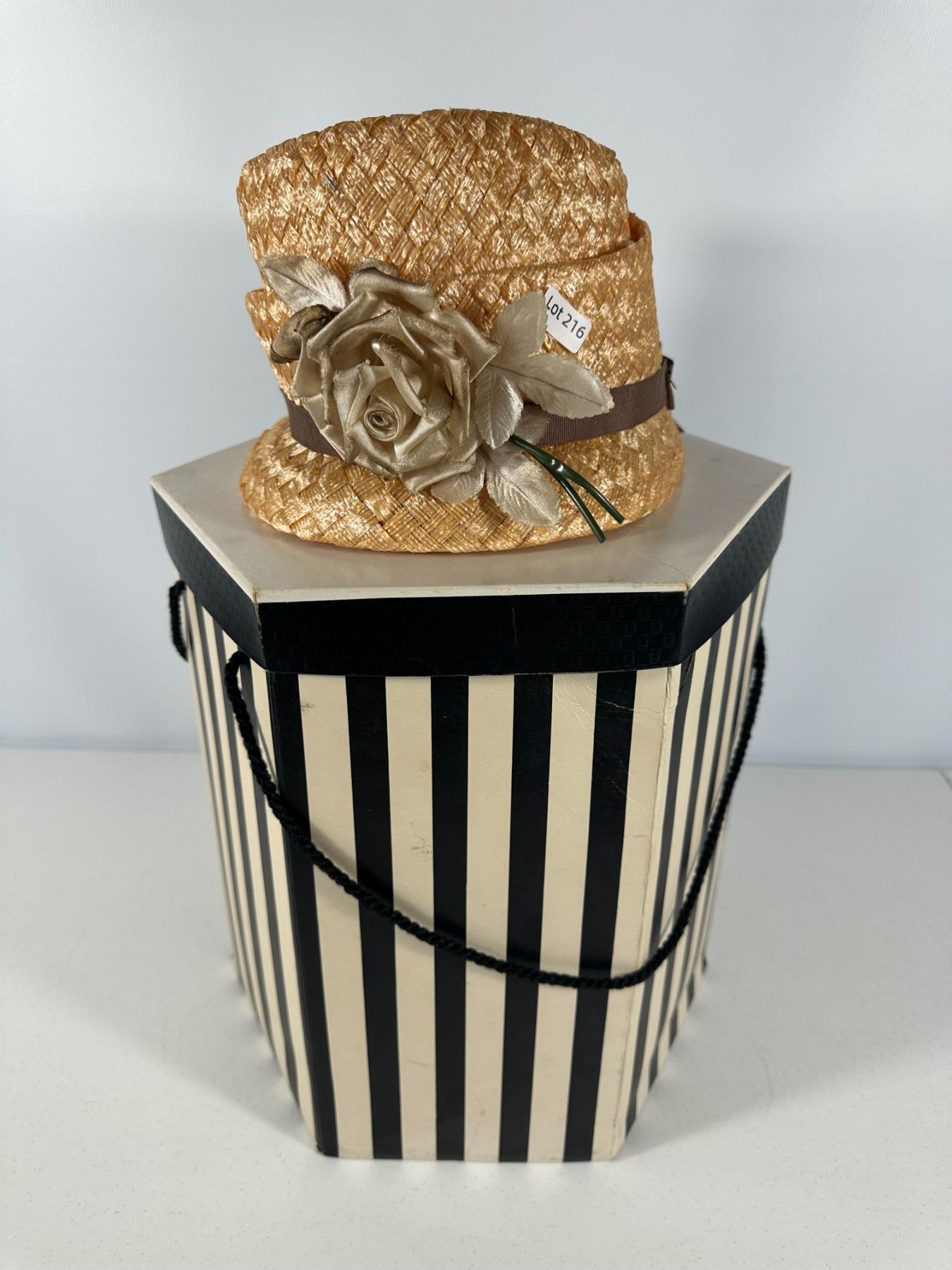Gold‑tone woven straw women’s hat with satin rose and bow; comes with a black‑and‑white striped hexagonal hat box (not original).