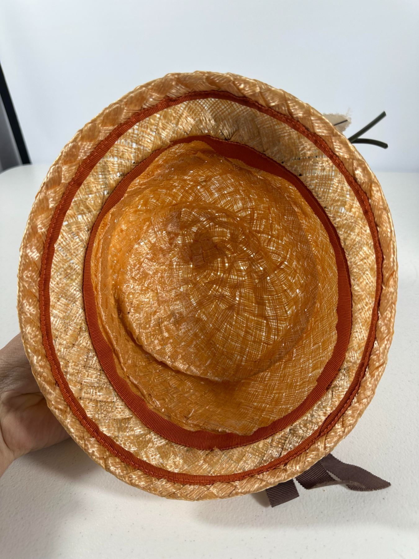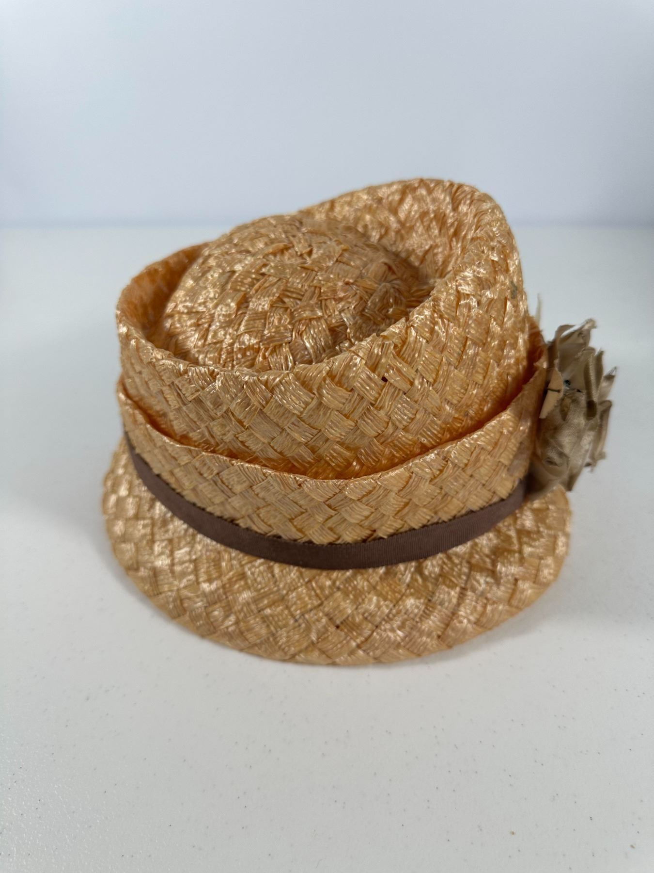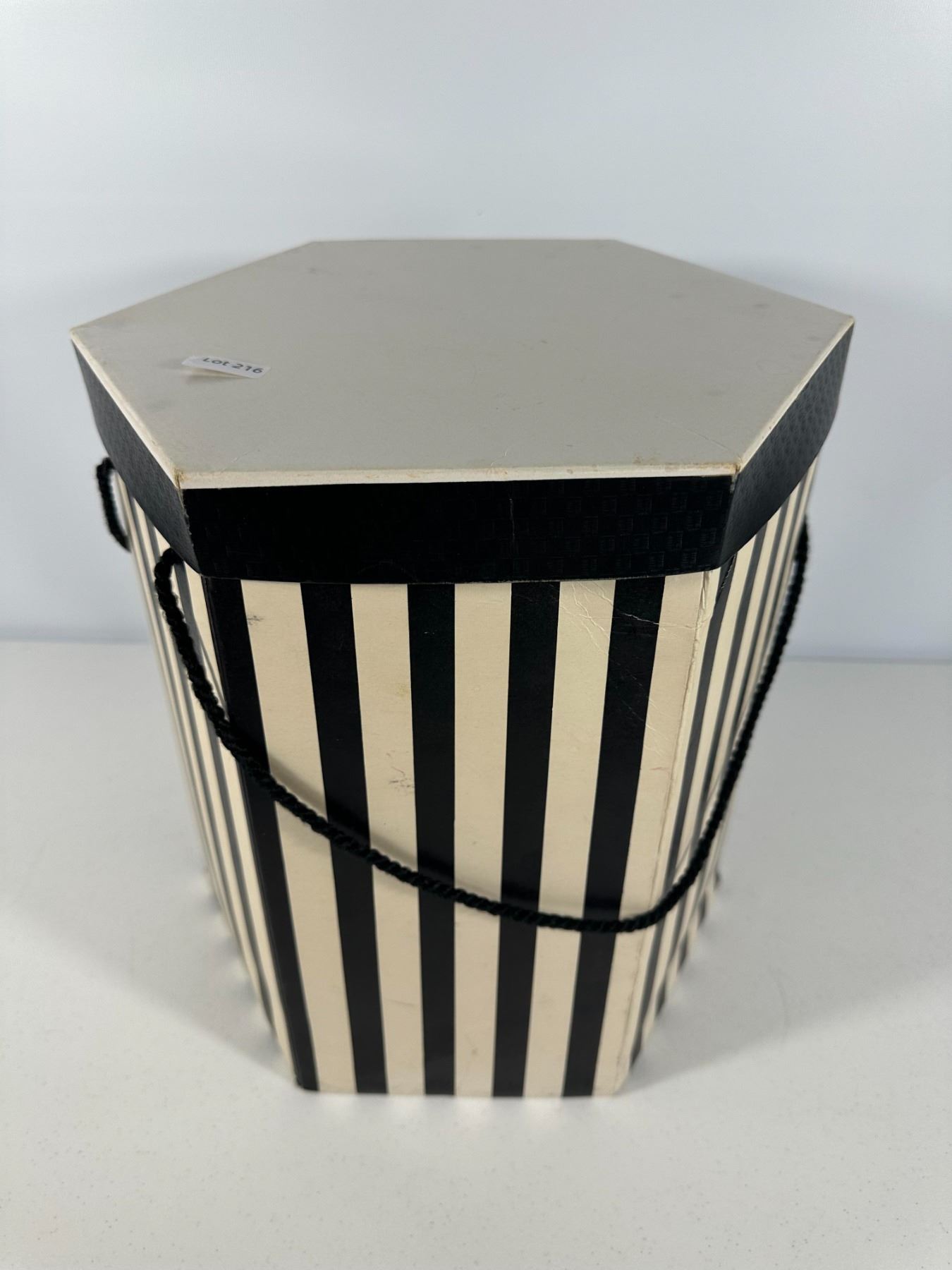 Gold‑tone woven straw women’s hat with satin rose and bow; comes with a black‑and‑white striped hexagonal hat box (not original).