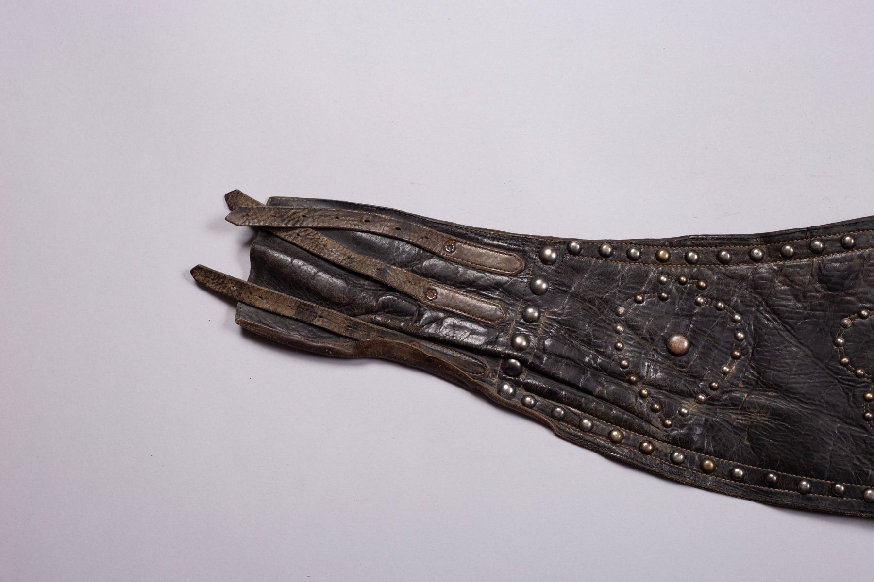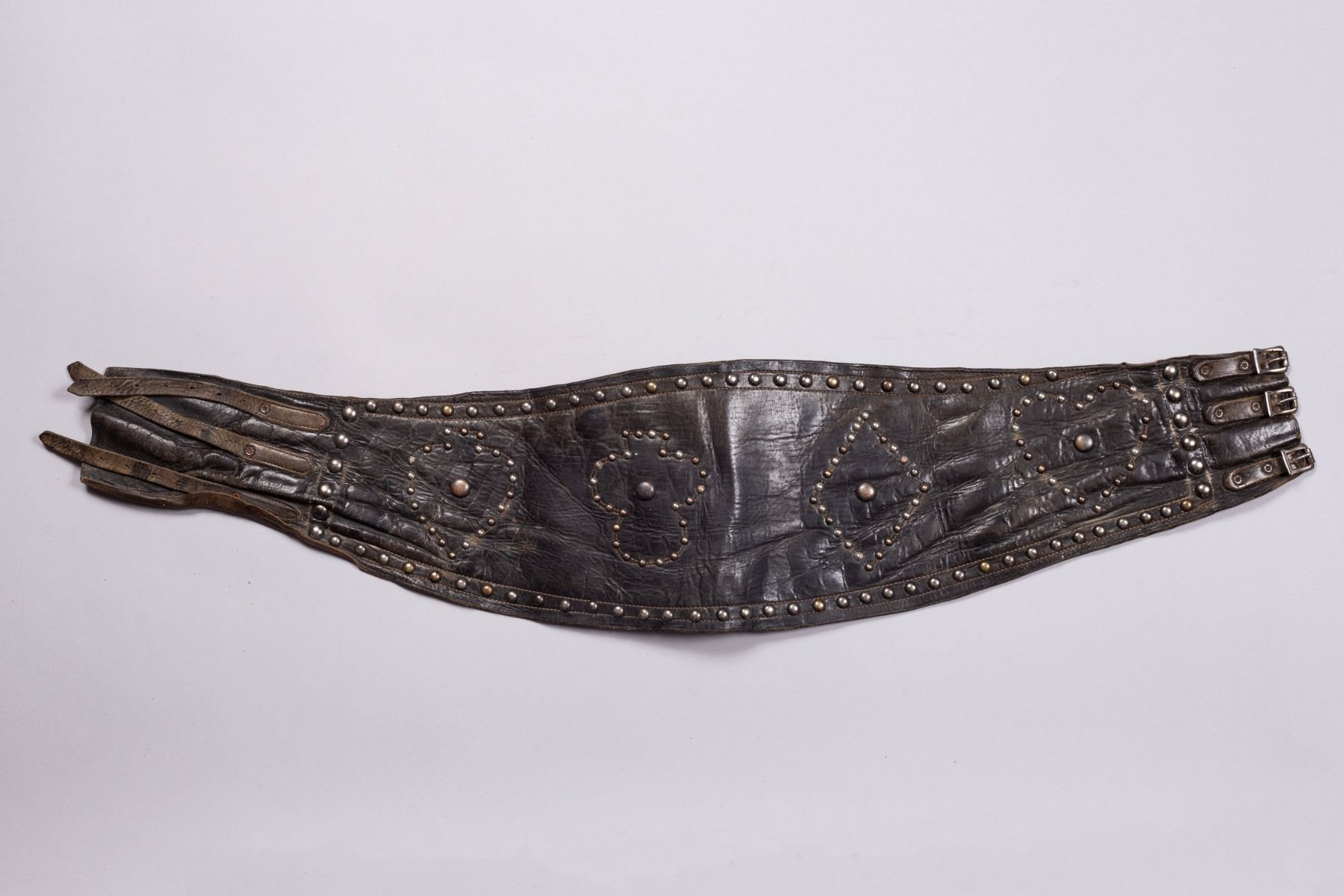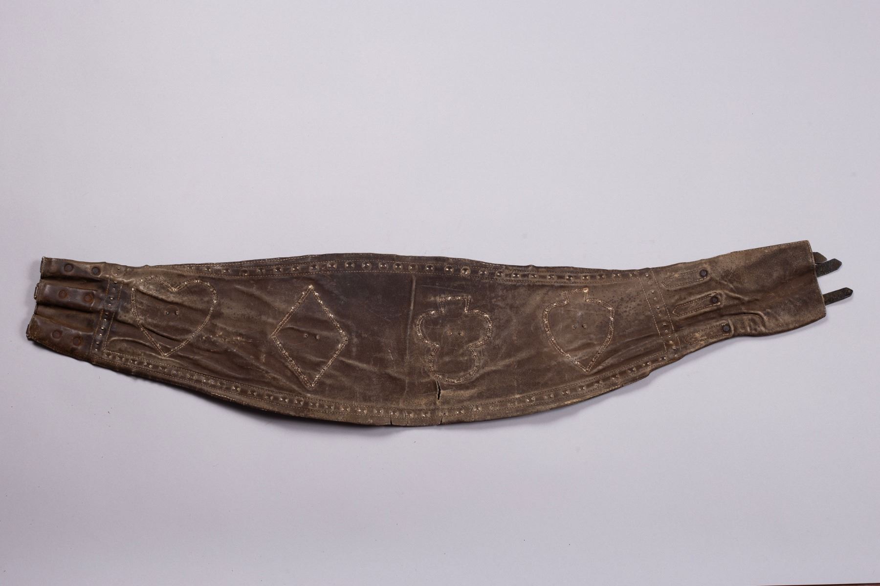 This is a striking, original vintage studded bronc riding belt, featuring the classic card suit design of spades, clubs, hearts, and diamonds. These unique, wide belts were originally worn by rodeo rough stock riders and early motorcyclists for back support, and they are now sought-after collectibles and bold fashion accessories.