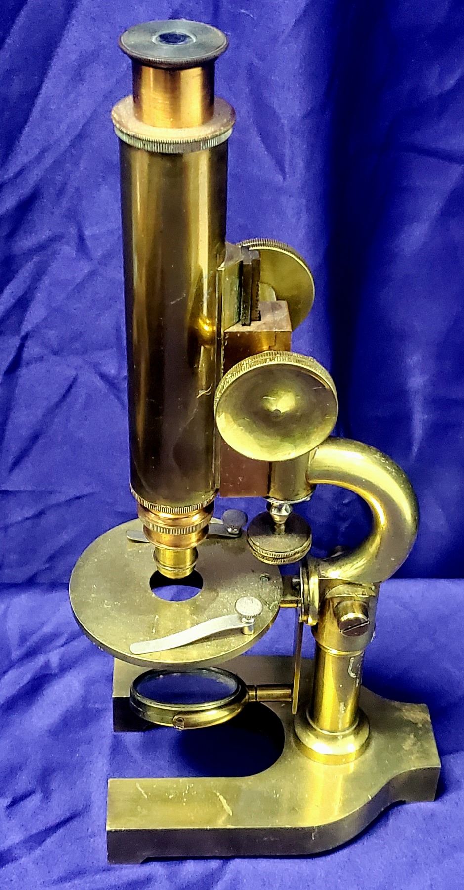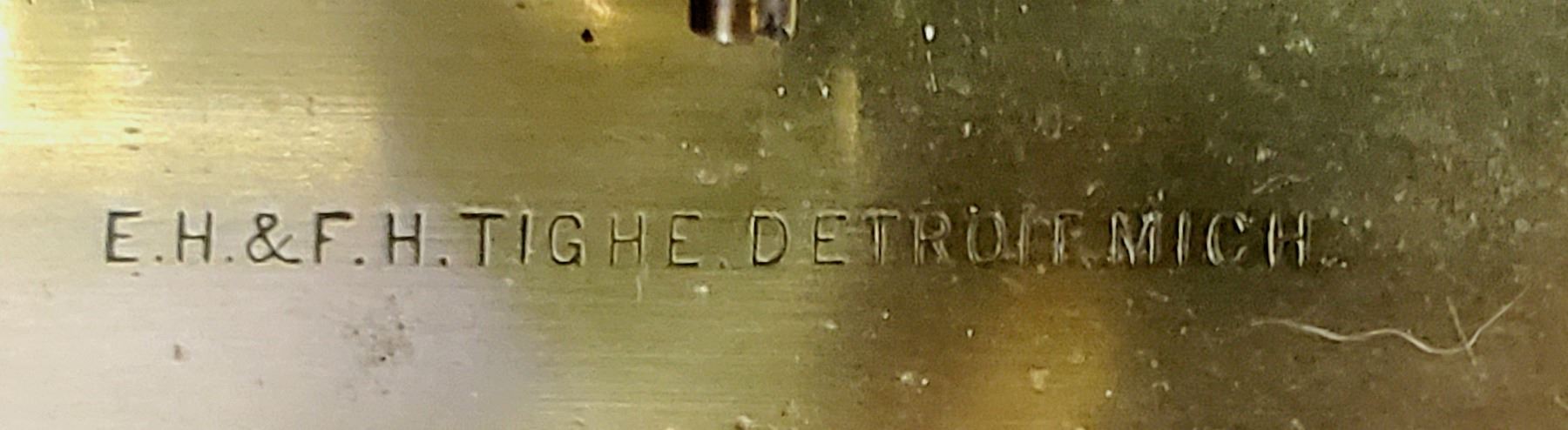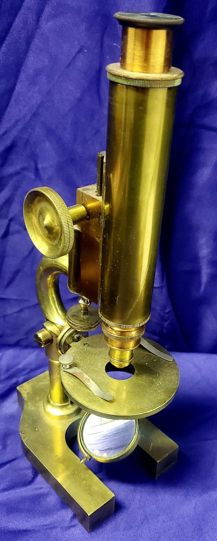 This Vintage Monocular compound brass E. H. and F. H. Tighe Student Microscope Circa late 1800's. The brothers Edward and Frederick Tighe started the firm which made these microscopes. The base is the "horseshoe" shaped foot design and is signed " E. H. and F. H. Tighe. Detroit. Mich." This microscope appears to be all original which includes the reflector lens. 11.5 inches H x 3.5 inches W x 5.25 inches D. In very good condition.