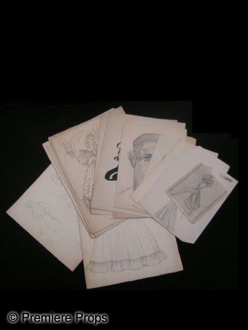 A large lot of vintage hand-drawn costume sketches made for various productions from different studios. 10 of the sketches are done on thick construction paper and feature images of women in dresses, a pair of black shoes, and an alphabet letter study. The name 'P.F. Anderson' is written on the bottom of a couple of them. The other sketches are done on regular paper and feature various character studies, and all the pages have turned brown with age.