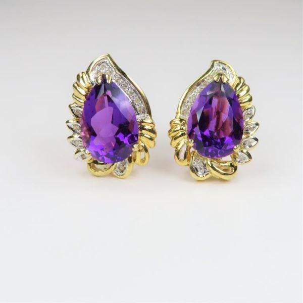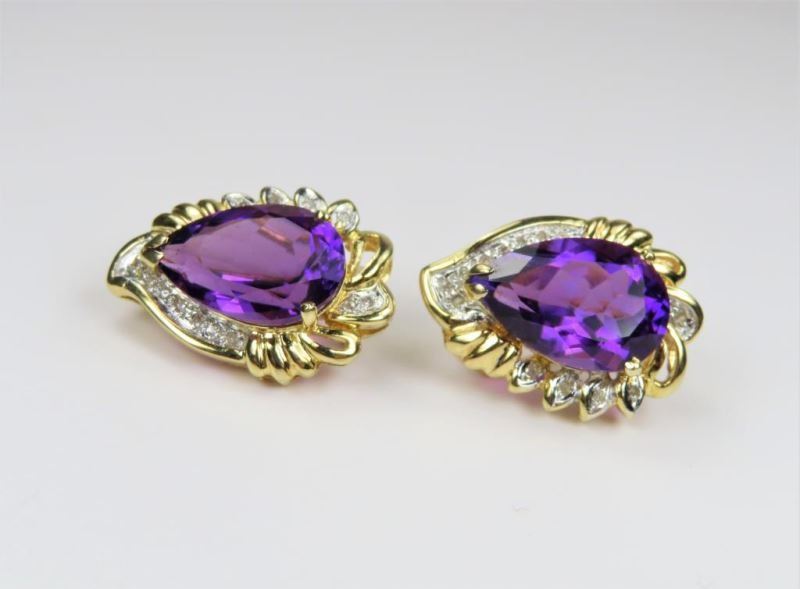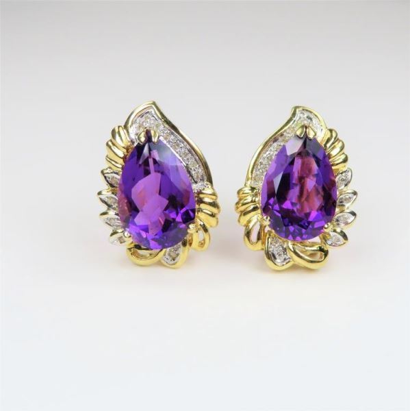 Splendid Vintage Style Amethyst and Diamond Earrings featuring two large matching pear shaped Amethyst weighing approx. 12.00 carats richly colored with VS clarity accented with 28 side Diamonds set in 14 karat yellow gold Omega style clip backs.