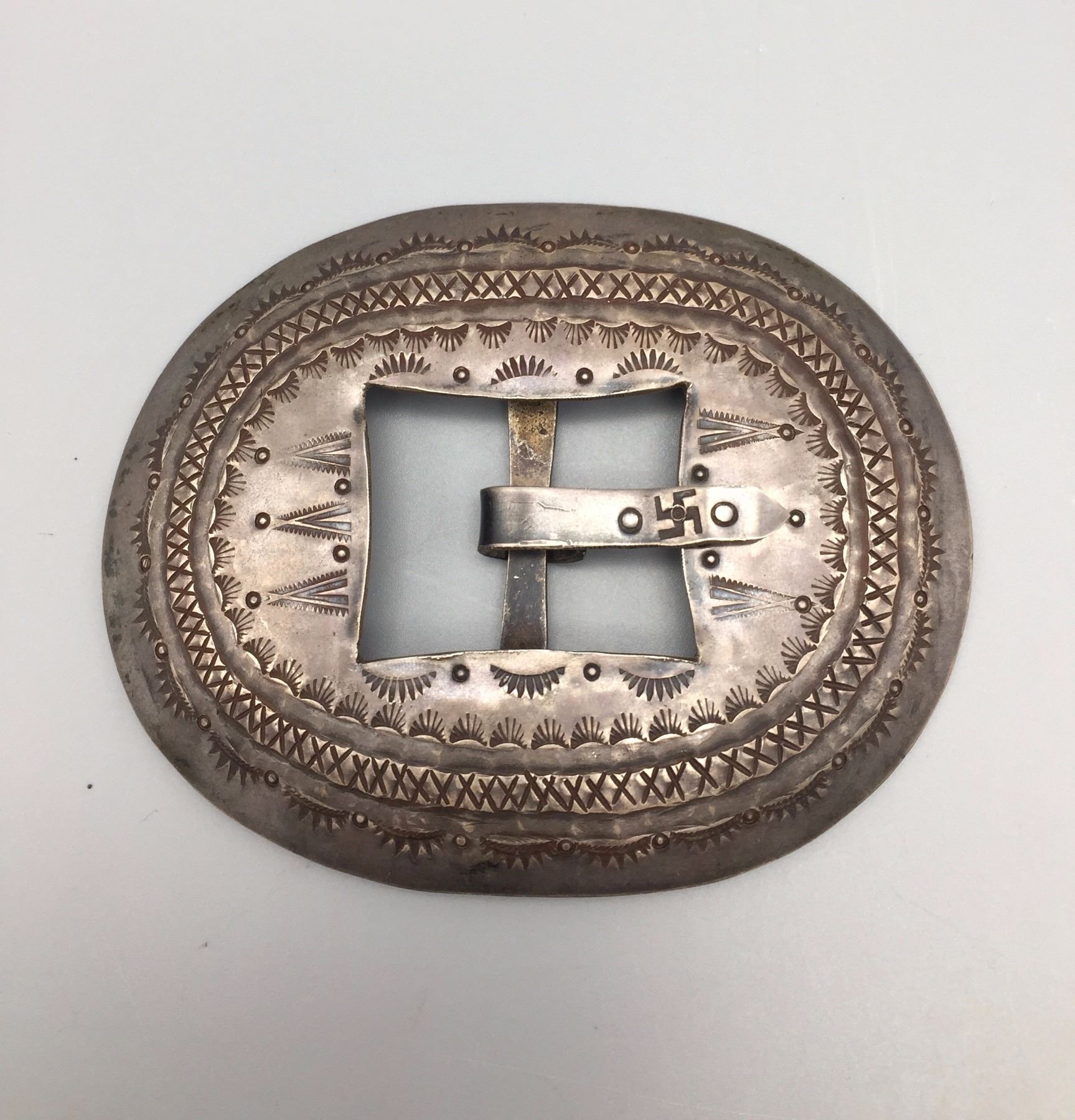 Maker: Unknown, unsigned. Approx. Age: Vintage. Size: Measures 4” w x 3 1/8” h and fits a belt 1 1/4” or smaller. Weighs 67.6 g. Additional Info: An old-school belt buckle with the whirling log and other stamped designs. Condition: Good for it’s age, minor wear expected. Please look closely at the pictures - they are an important part of our description. Shipping: There will be a $5 handling / packaging fee for shipping this lot. The actual cost of postage will be added on top of that.