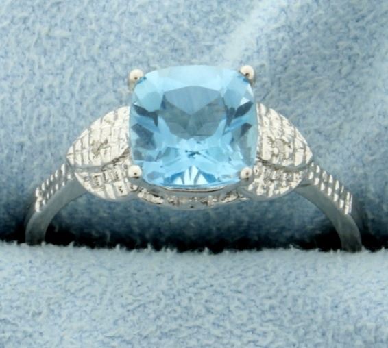 Contains a 1.7ct cushion cut blue topaz set in platinum over sterling silver. Size 7 1/2 2.8g