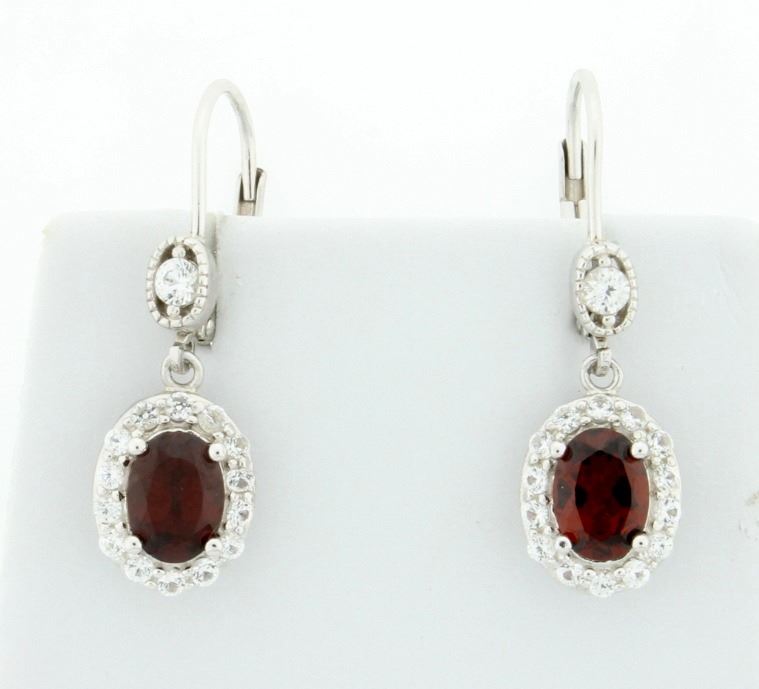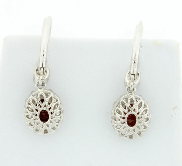 Genuine 5x7mm oval Garnet gemstone dangle earrings with White Sapphires set in sterling silver mountings. Check out the beautiful back of the earring! 3.3g
