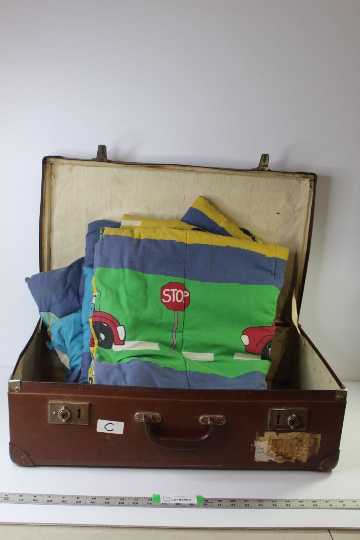 Vintage Suit Case (26" x 16" x 8.5"), Children's "School Bus" Blanket