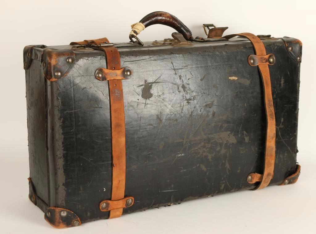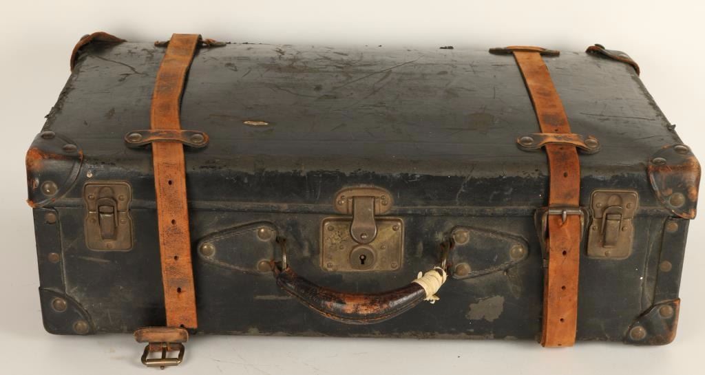 Made by the Warchester Metal Goods Co. Black leather wrapped with brown leather straps. Appears to have been repaired on handle. Rustic condition.