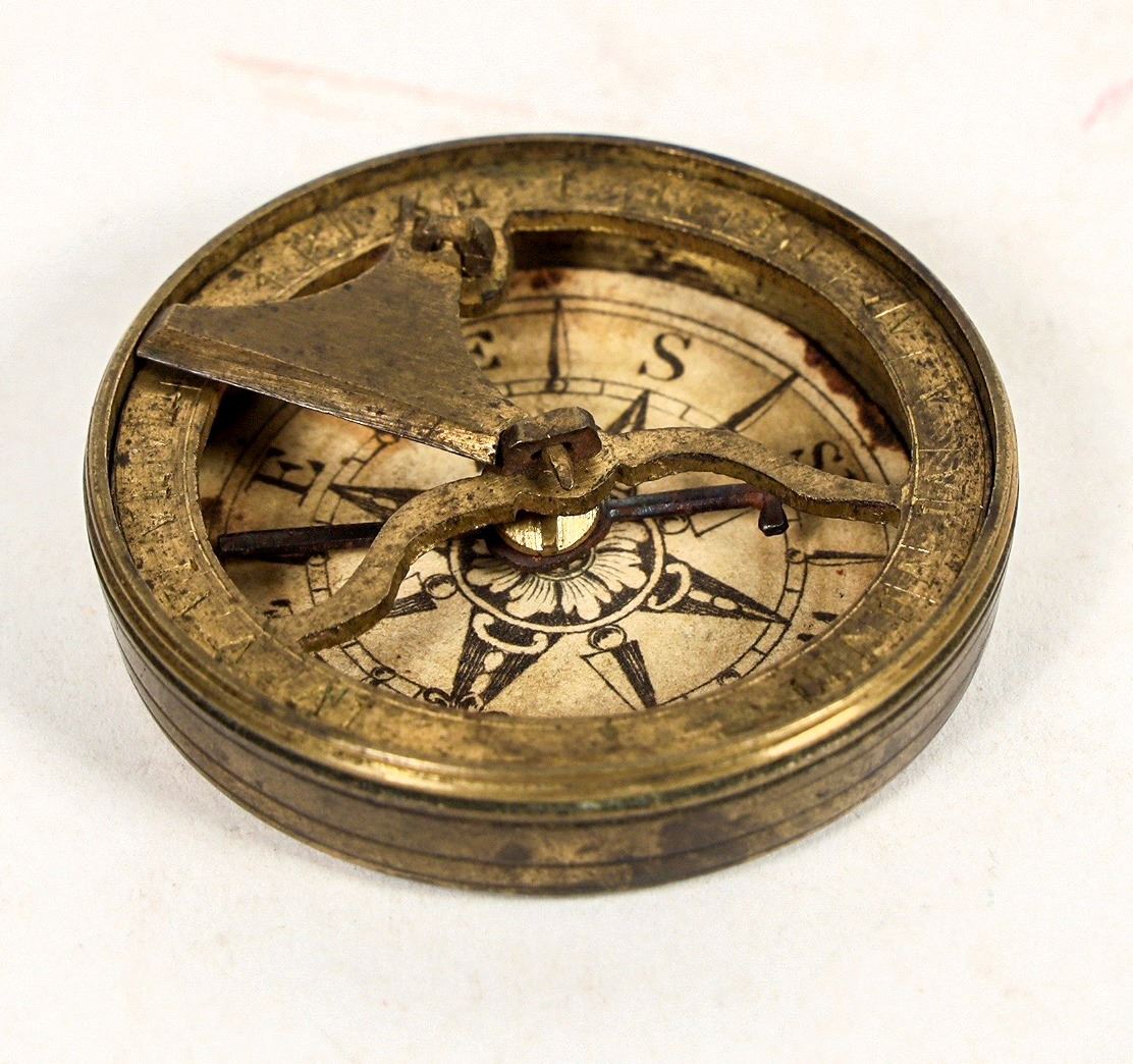 This sundial compass was made in the 1920's without any makers mark. At 1.75 in. in diameter. The card is paper darkened with age. The needle is slow. Fine craftsmanship and the lid screws on; unlike replicas. From the Popovich collection. Please see photo for details.