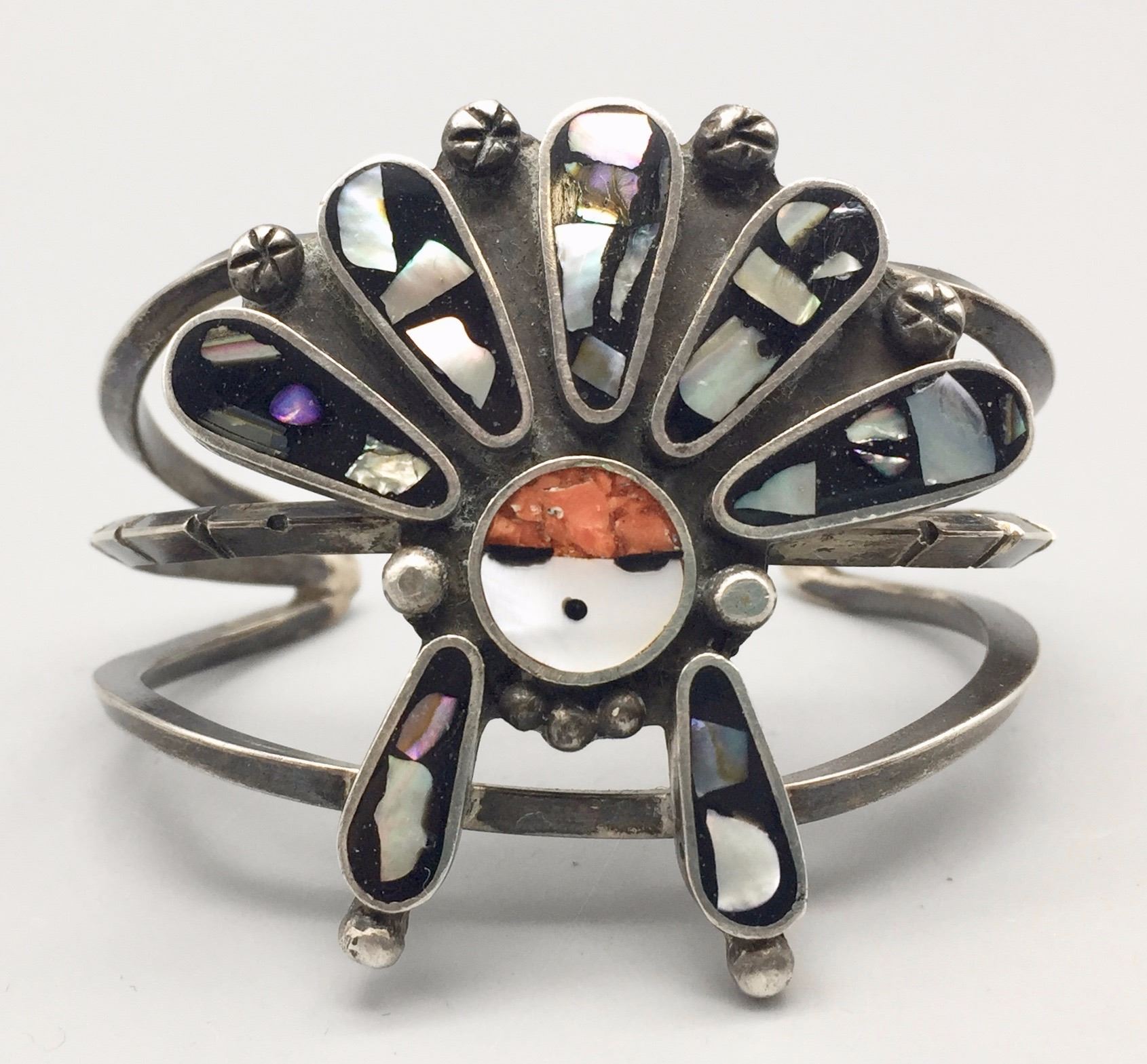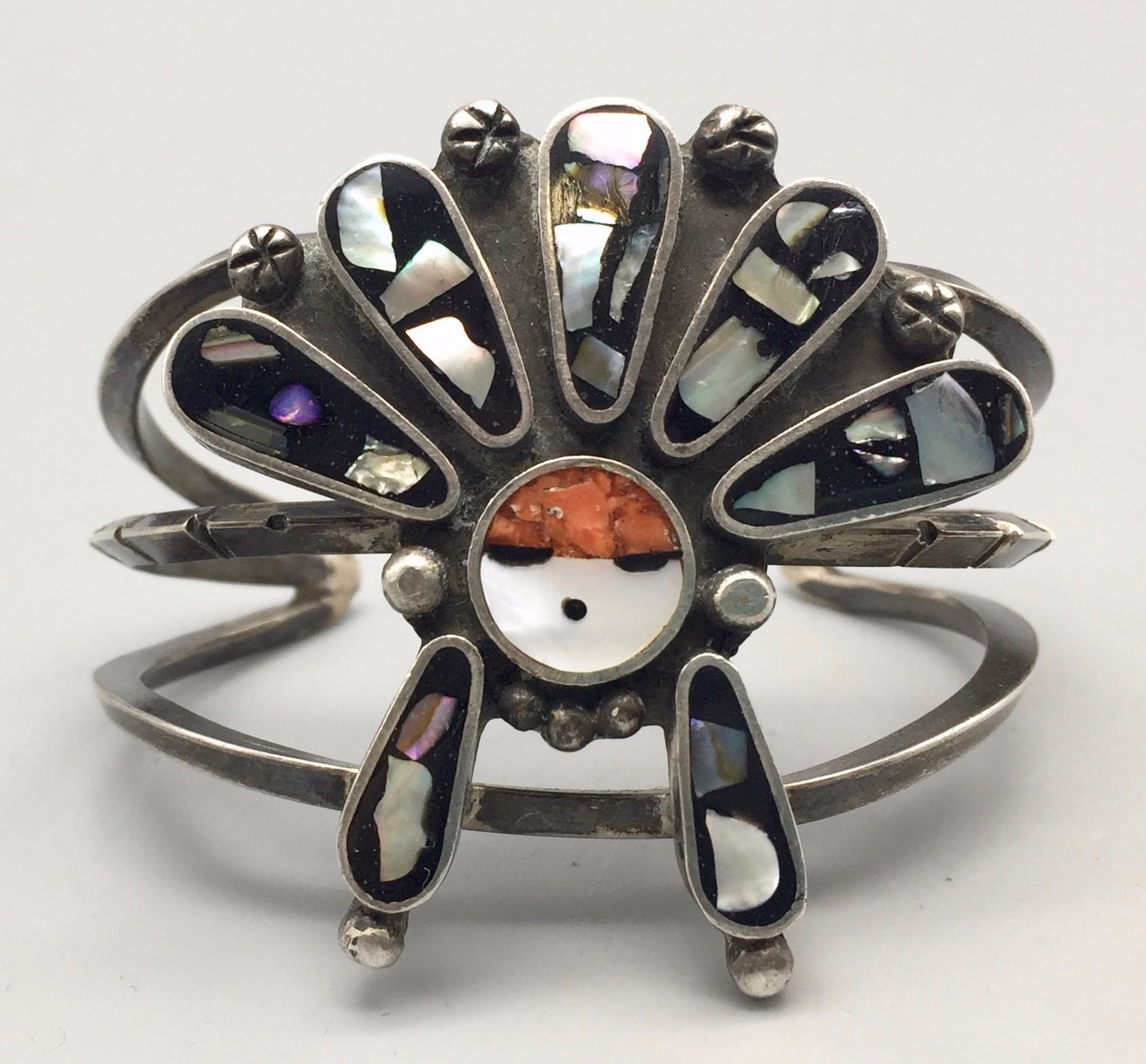 Maker: Unmarked, but most likely Zuni. Approx. Age: Vintage (Circa 1970s). Size: Inside circumference of bracelet is 4 1/2” plus it has a 1 1/8” opening (making it fit a 5 5/8” wrist). Bracelet is 1 3/4” at it’s widest point and weighs 38.1 g. Additional Info: Cuff bracelet features Abalone, Mother of Pearl and coral inlay. Tested as sterling silver. Condition: Good. Normal wear expected. Please look closely at the pictures - they are an important part of our description. Shipping: There will be a $5 handling / packaging fee for shipping this lot. The actual cost of postage will be added on top of that.