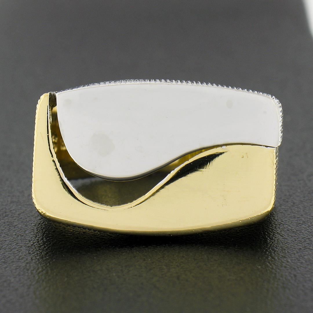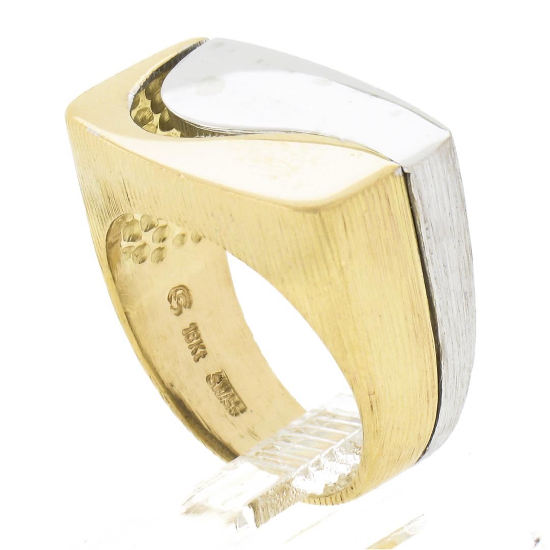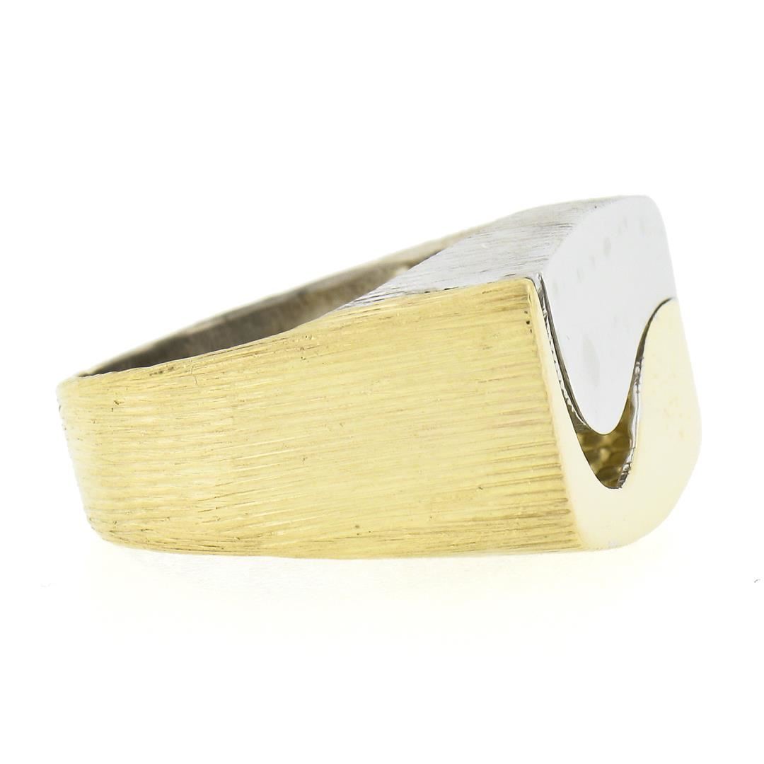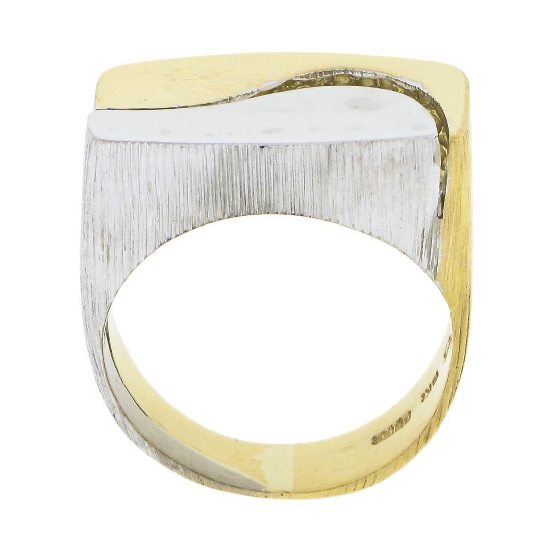 A vintage solid 18k yellow & white gold ring. The ring is size 7.0, weighs a total of 10.69 grams, and measures 12.2mm wide.