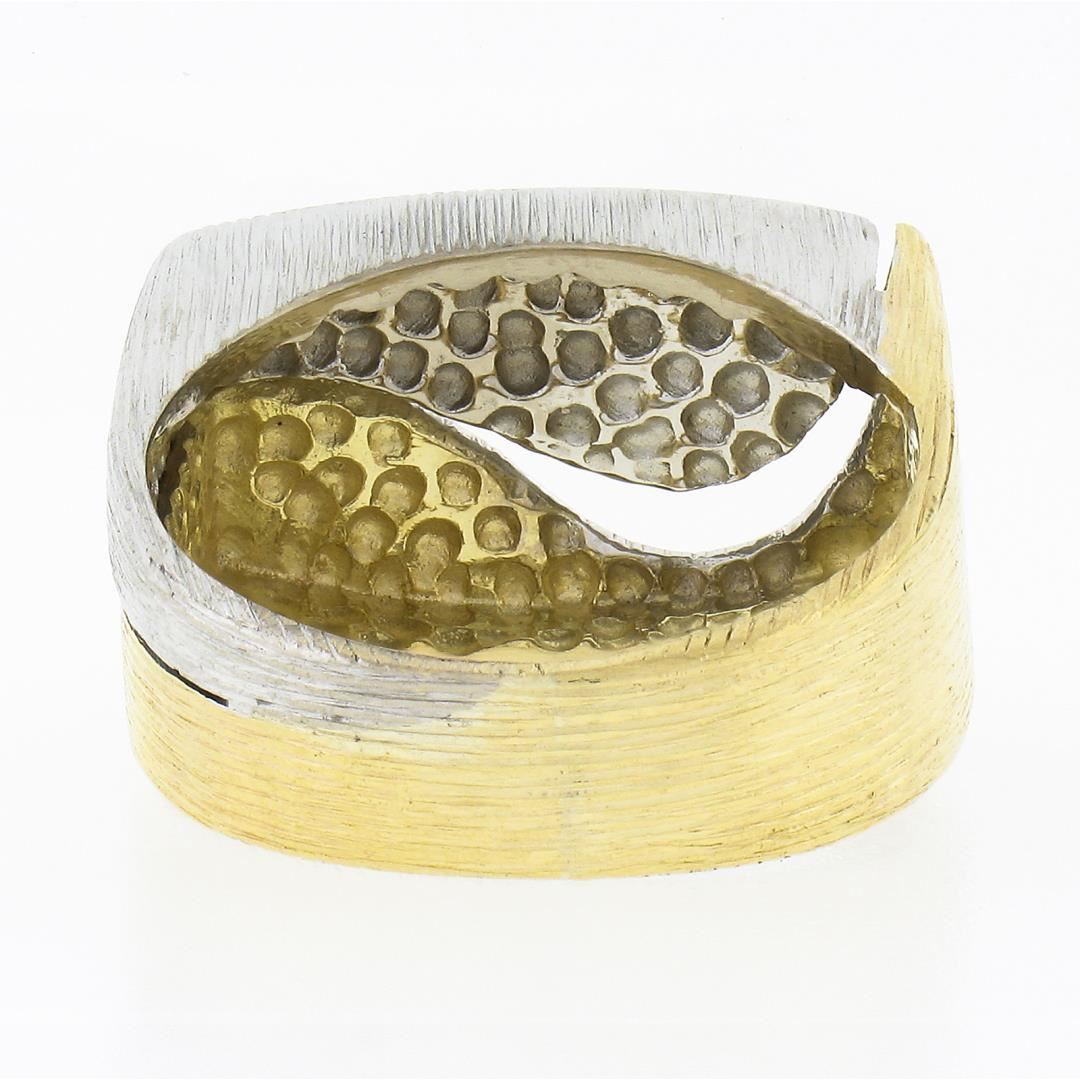 A vintage solid 18k yellow & white gold ring. The ring is size 7.0, weighs a total of 10.69 grams, and measures 12.2mm wide.