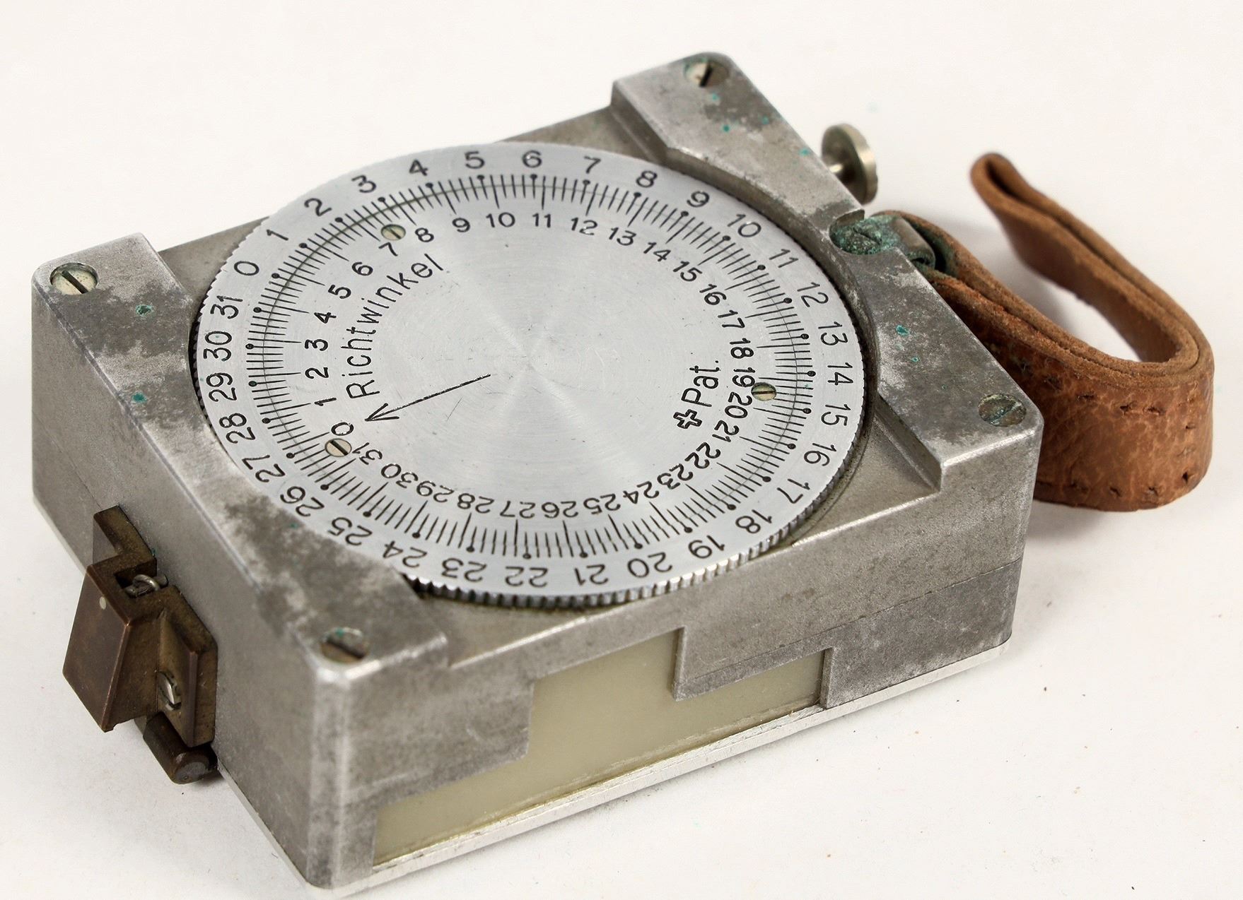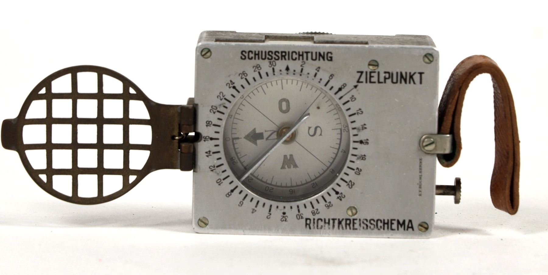 This is a vintage swiss army compass made by Schussrichtung Zielpunkt. Beautifully made artillery compass with sighting glass. With a leather carry strap. From the Popovich collection. Please see photo for details.