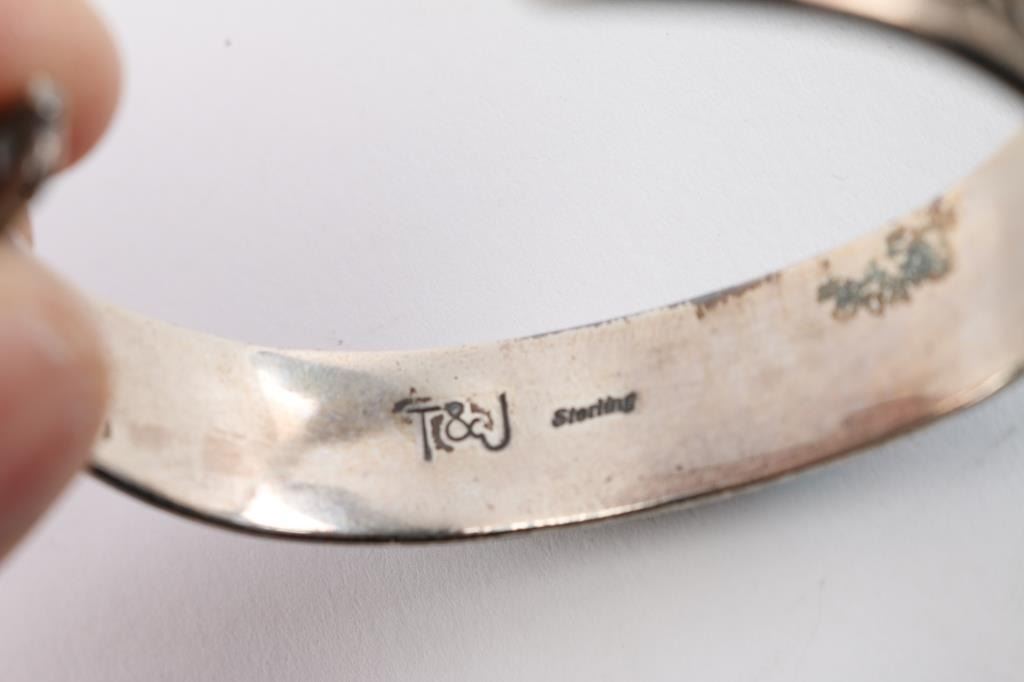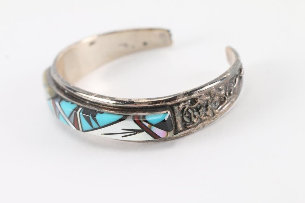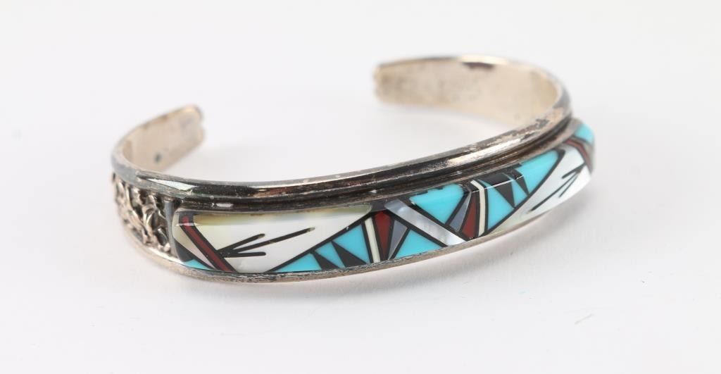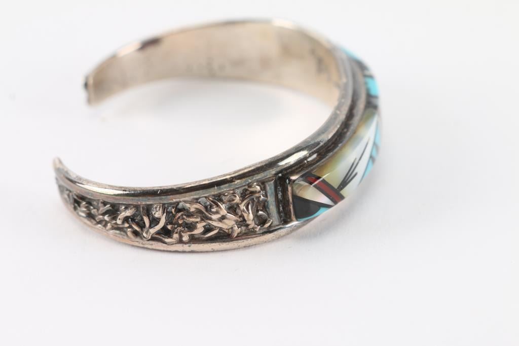 With turquoise, mother of pearl, onyx and more. Measures 2" including gap. Signed.