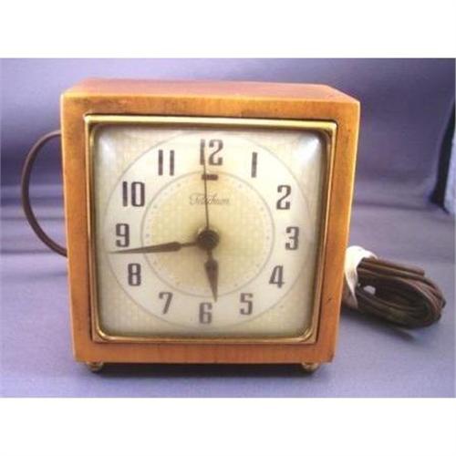A fabulous Vintage TELECHRON Bakelite Clock is presented. This circa 1950's wood case desk or nightstand clock is Telechron Model 7H209 given the name Gracewood. This vintage clock also has an alarm! This vintage wood Telechron clock is a perfect addition for collectors of vintage timepieces and clocks! <p>Telechron clocks were first trademarked in 1923. Literally in Greek, the word Telechron translates to mean "Time from a Distance." At one time the Telechron Company was owned by GE. <p>This Telechron Cock, Model 7H209, Gracewood, as stated above, is a wood case clock and is circa 1950's. The case is a rich grainy wood. It measures 4 inches square. It is 2 inches deep. The face of this Telechron clock is an oatmeal color with deeper tones on the border of the face as well as the inside of the face.  The numerals are brown as are the hands. The face of this vintage timepiece is bordered in brass.  There are also four round brass feet on the bottom of the clock.  BE SURE TO SEE ALL PHOTOS. <p>The bottom of the clock still retains the original paper label which reads:  TELECHRON ELECTRIC CLOCK MODEL 74209, DEPARTMENT OF GENERAL ELECTRIC, along with pertinent voltage information.  (SEE PHOTO OF LABEL). <p>The Telechron Clock Company manufactured many different models, and this is a very  interesting one. This wonderful vintage wood case clock works absolutely perfectly with the cord being perfect as well. The wood case is in mint condition. The whole clock is in exceptionally wonderful ...