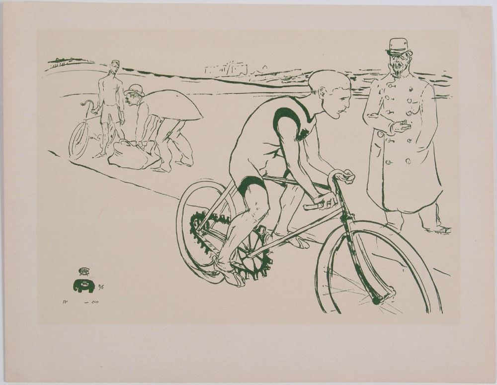 This is a vintage lithograph print from the set printed in 1951 by Mourlot Freres of Paris. Original poster artwork by Henri de Toulouse-Lautrec. Printed on superb quality paper; colors are bright and crisp. SIZE: Approx. 9 1/2" x 12 1/2". This was Lautrec's first attempt at his La Chaine Simpson poster that was rejected by Louis Bougle, the Simpson representative in France, because of it's inaccurate depiction of the very thing it was meant to sell - the bicycle's chain. The professional racer shown here in training is Jimmy Michael, whom Bougle managed. (The famous young English champion, with his celebrated tooth-pick in his mouth) Although Lautrec left the lithograph unfinished, he issued an edition of two hundred, no doubt believing a market for the print existed among Micheal's fans. Following Dunlop's invention of the pneumatic tire in 1889, competitive cycling became the most fashionable sport in Paris. It's rise in popularity was stimulated by the cycle manufacturing business, which financed race tracks and supported a new sporting press in specialized magazines and news columns. By the mid 1890's, cycling champions had become popular heroes and the race at the Velodrome Buffalo and the Velodrome de la Seine were favorite places to go on Sunday afternoons. Lautrec went often in the company of Tristan Bernard, the author and playwright who had succumbed to cyclomania and become manager off the Buffalo and editor of 'Le Journal des Velocipedistes.' In 1895 Lautrec produced several lithographs set at the track including a portrait of his friend Bernard. These are what led to his commission to design a poster advertising Simpson bicycle chains.