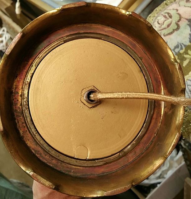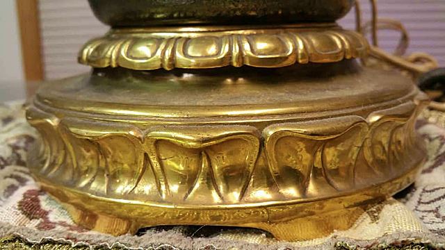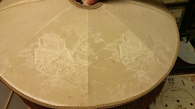 Vintage table lamp, attributed to Handel, with silk shade, fringed with oriental scene. Measures approx. 24 1/2" tall.
