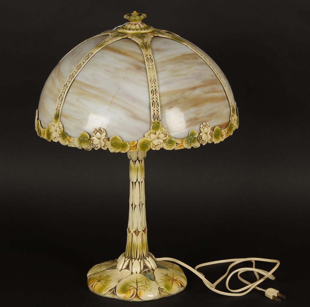With stained glass and white and green floral design. Circa 1930's. 22" high, shade 15" diameter.