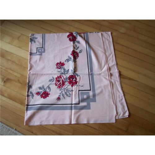 Very pretty pink tablecloth with red roses and black and grey designs.I can find no spots on this and the only thing wrong is one area of the hem(about 4") needs to be re-sewn.No holes or tears.