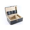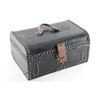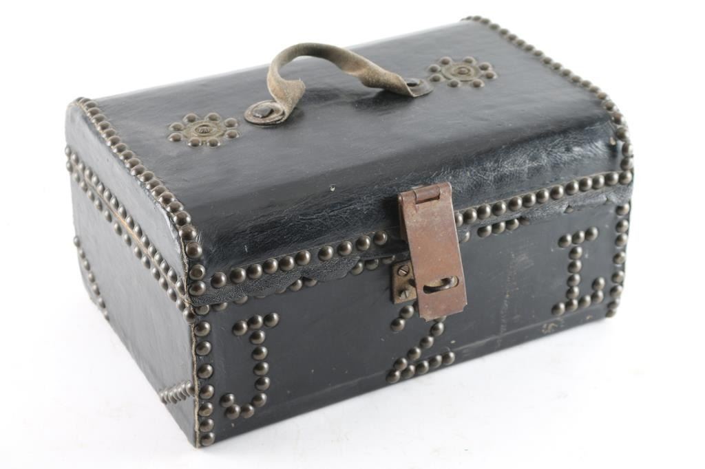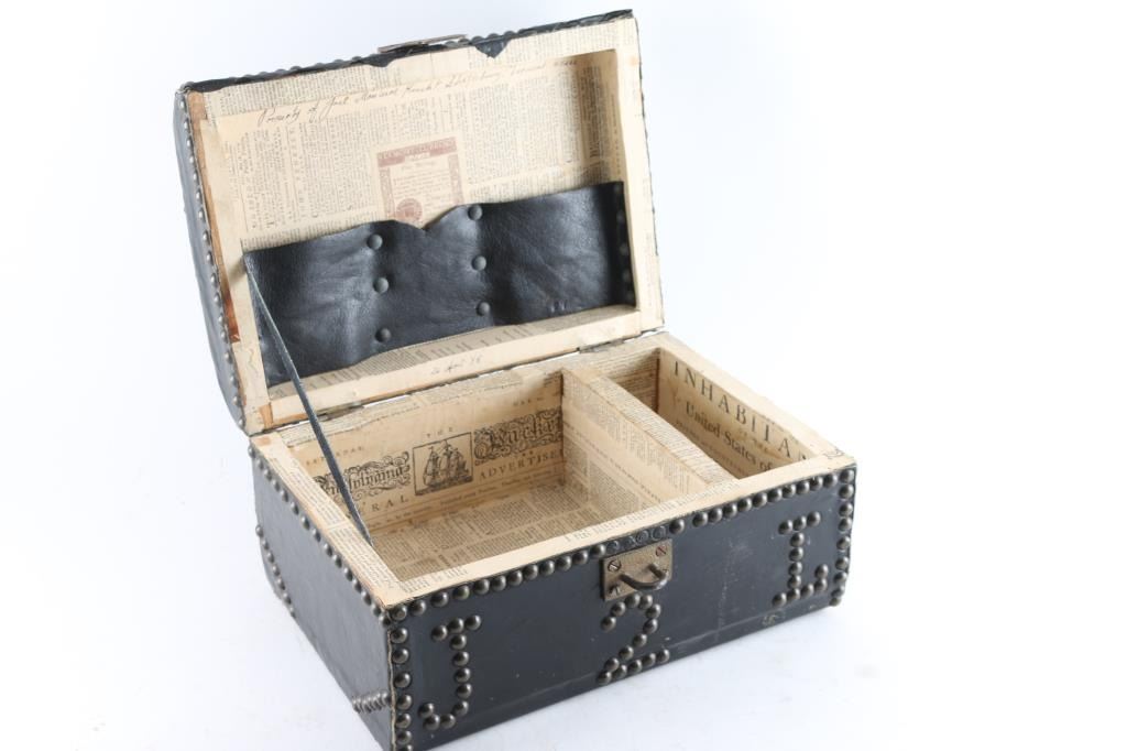 Leather wrapped box with tacks maked "J2L" with leather handle. Newspaper lined written in pen inside "Property of Joel Monture Knecht Shaftsbury Vermont 05262" 14"X11"
