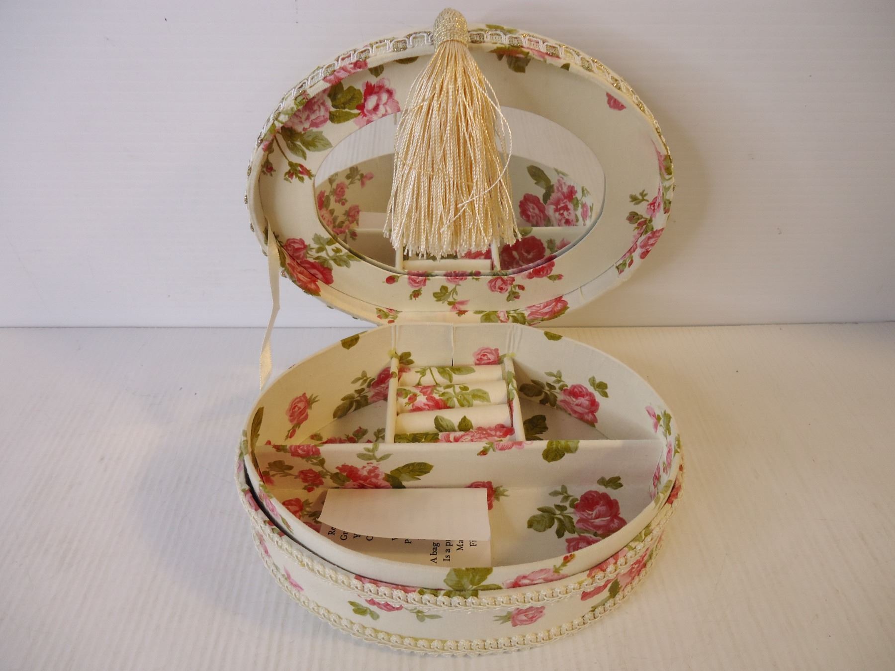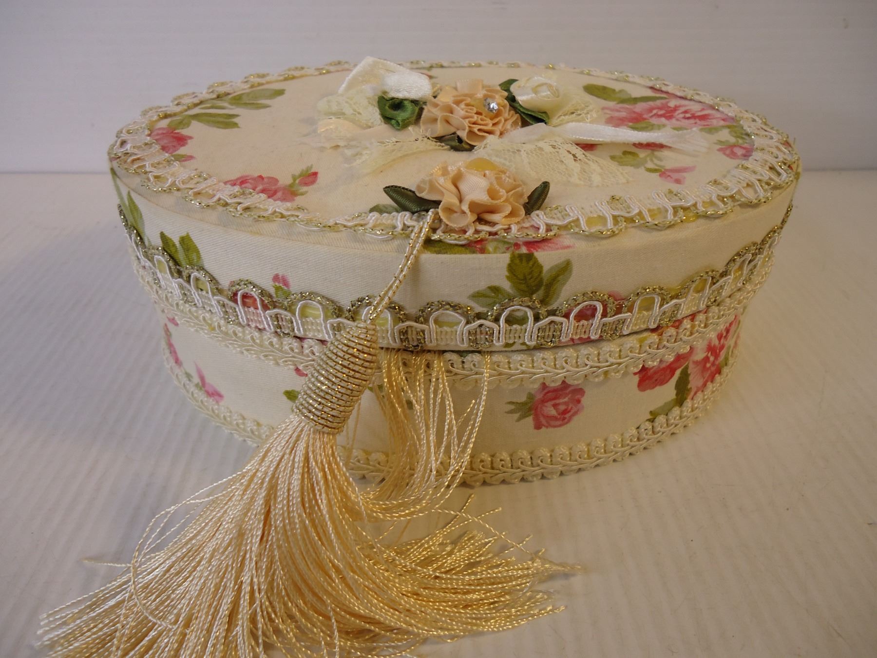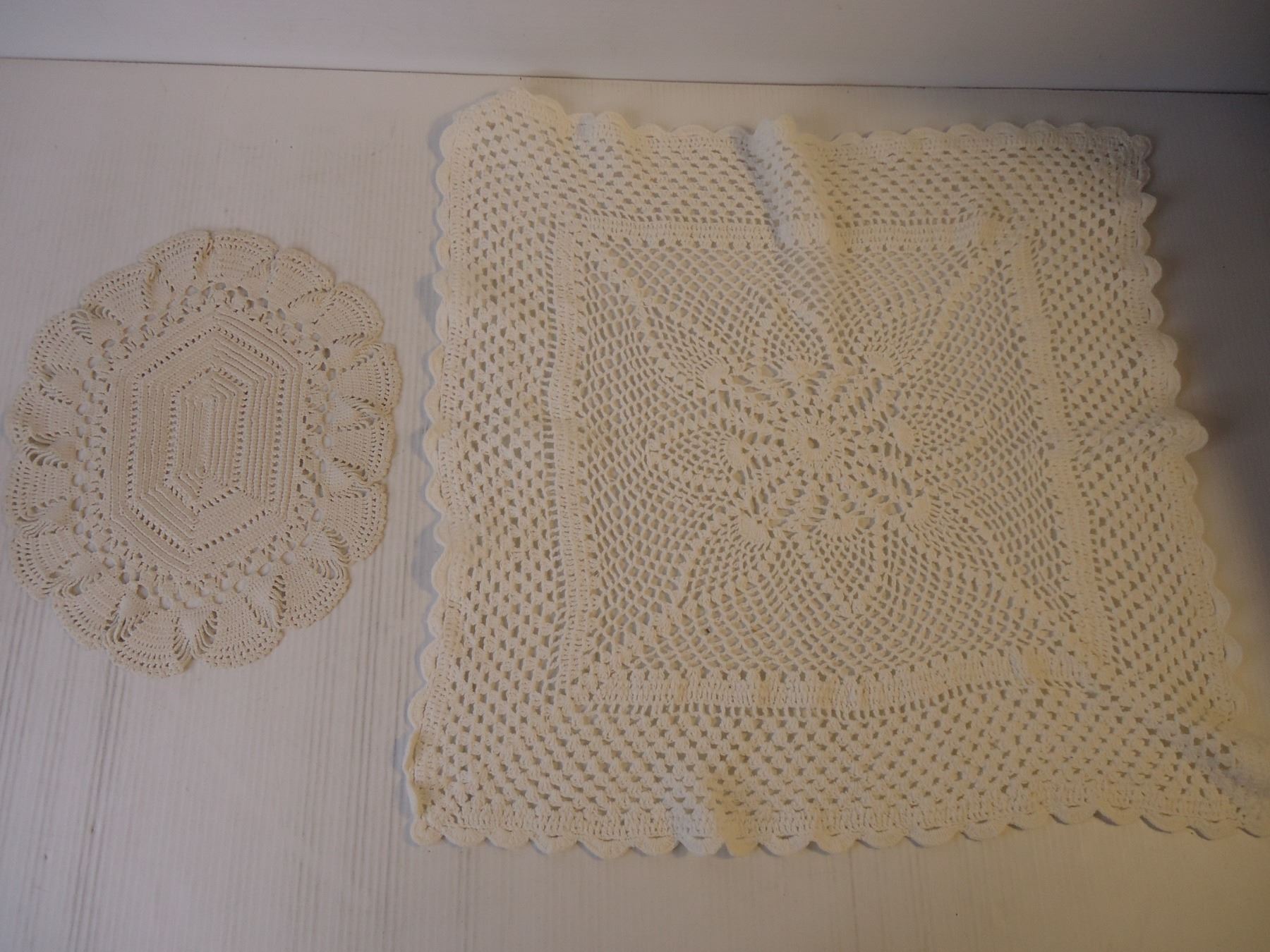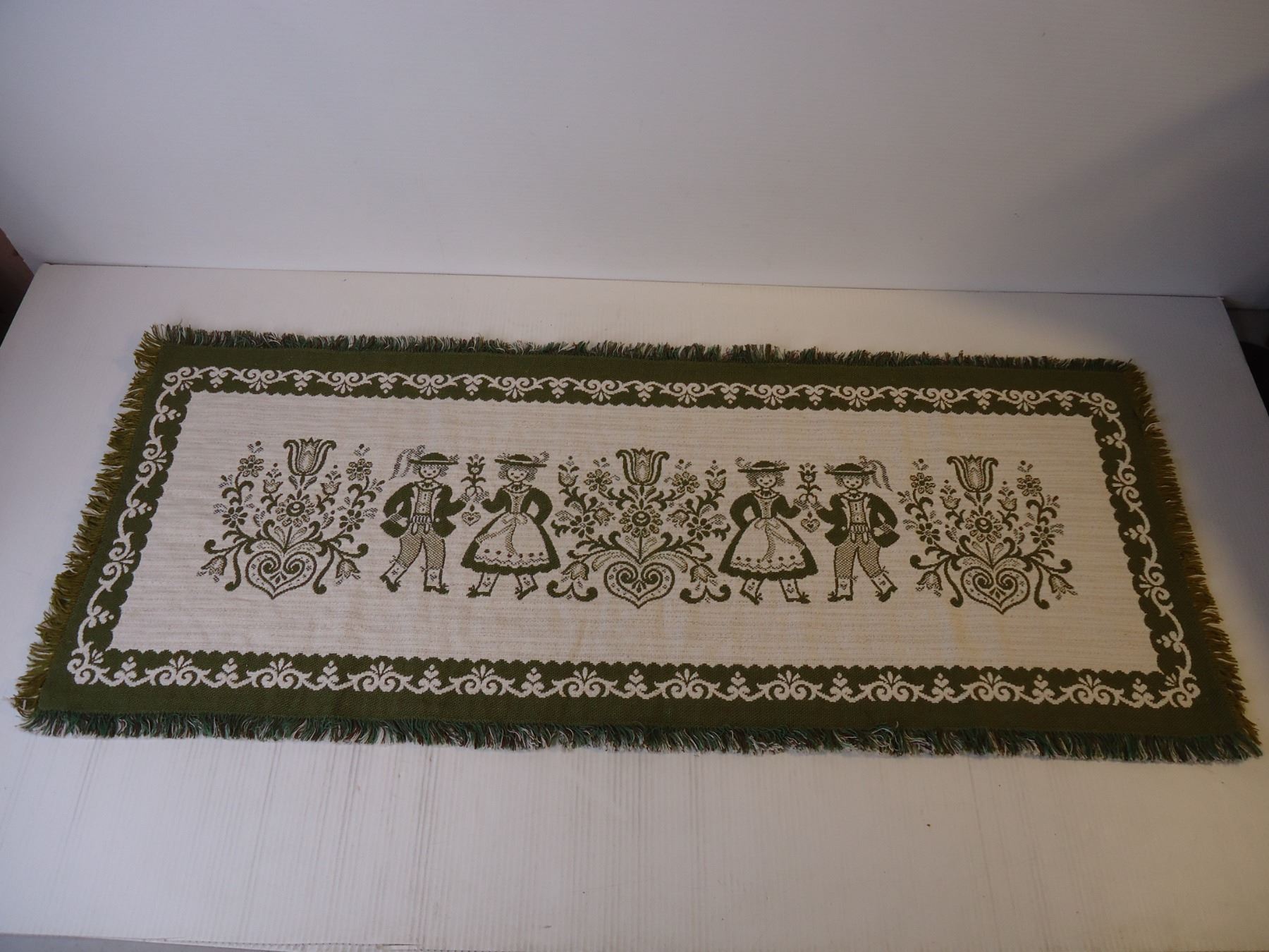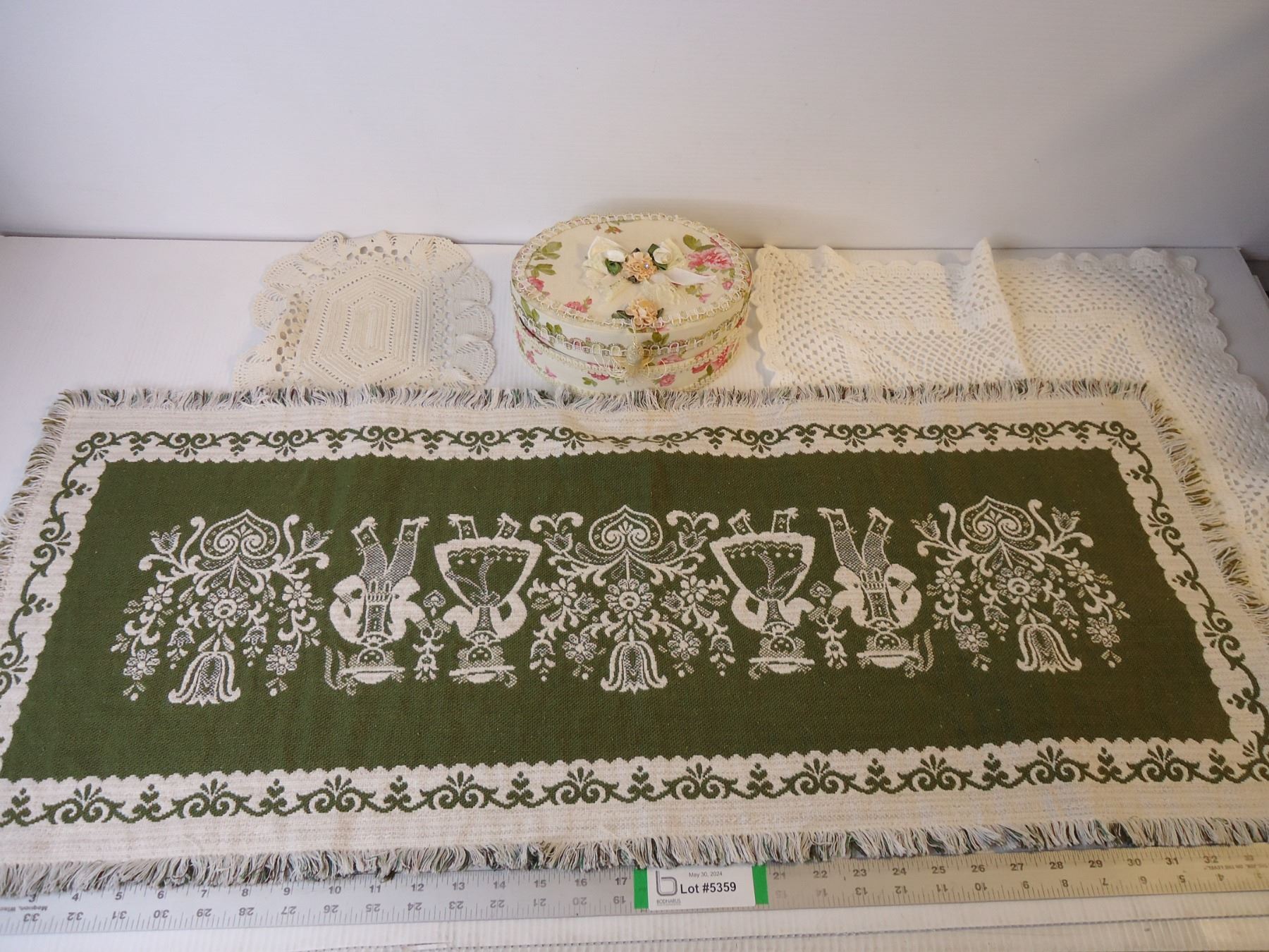 Vintage Tapestry Table Runner, Doilies, and Oval Jewelry Box