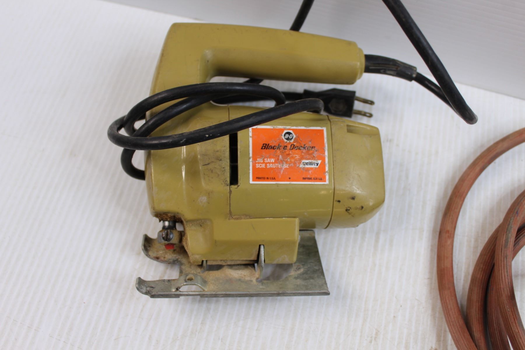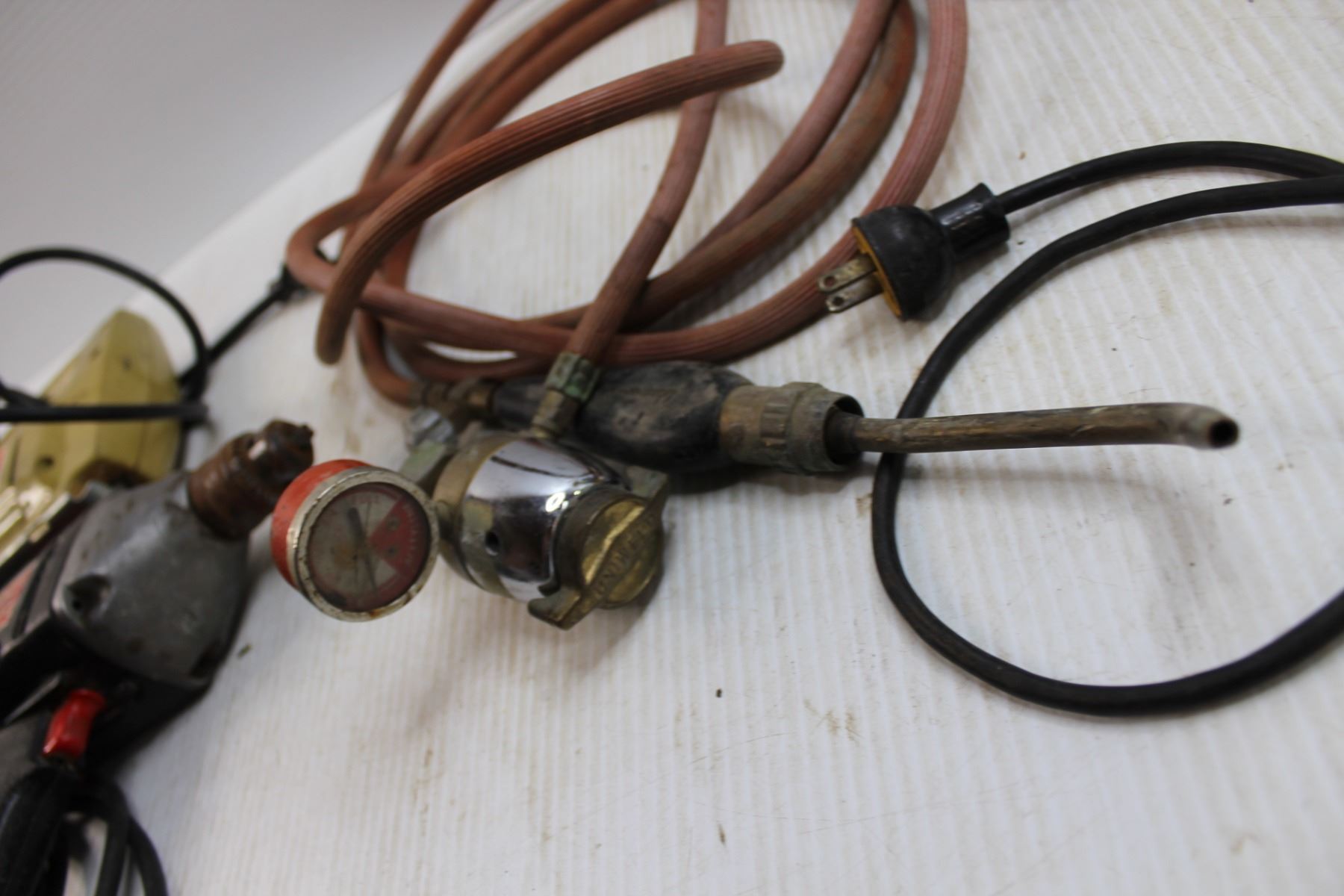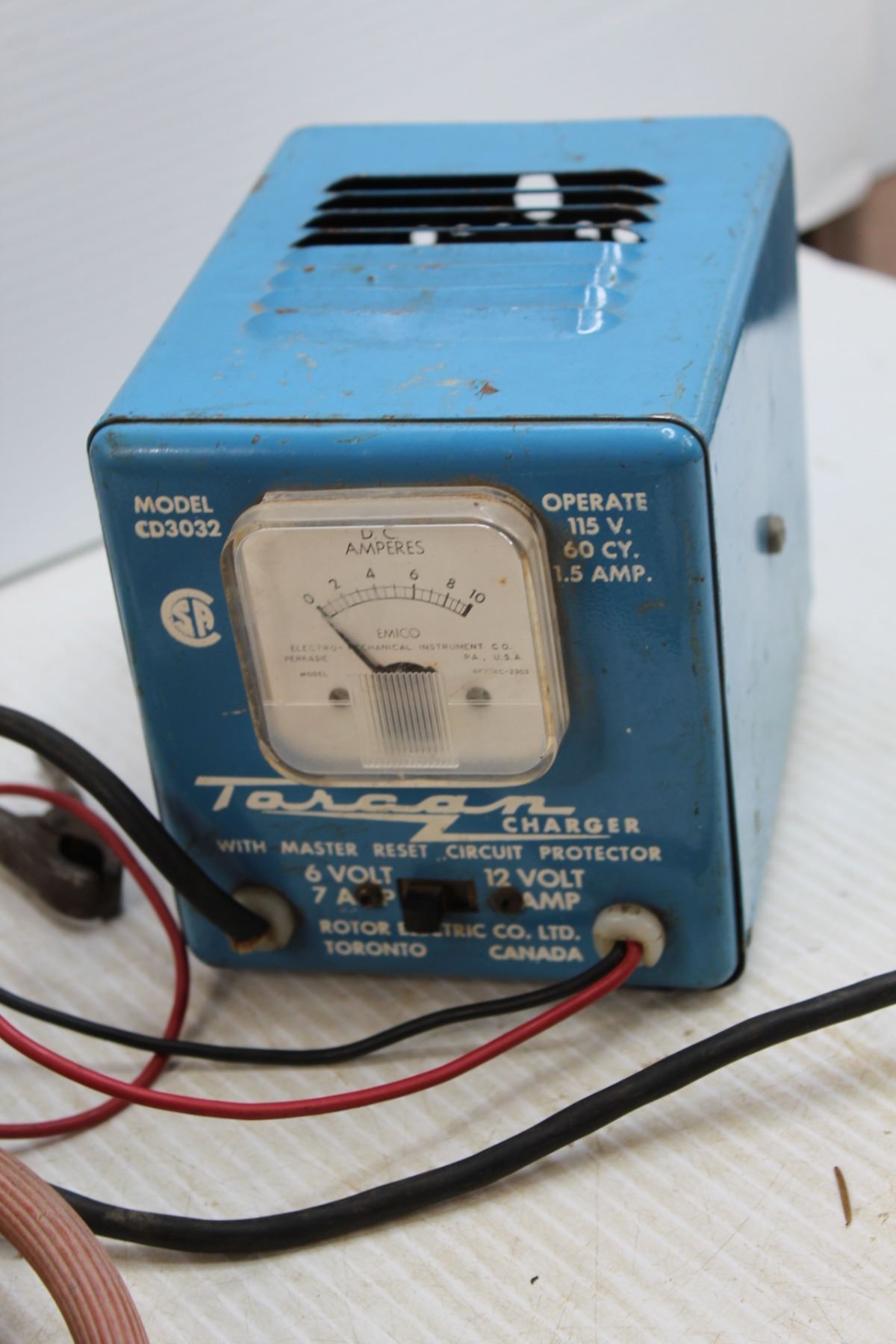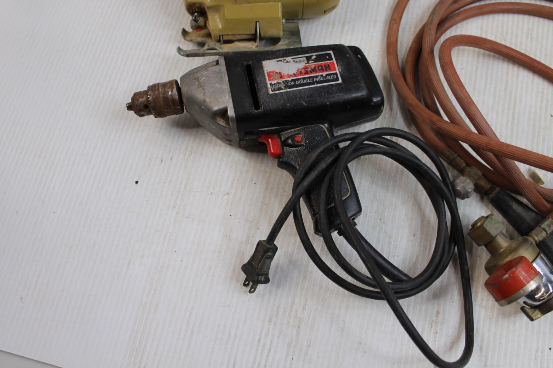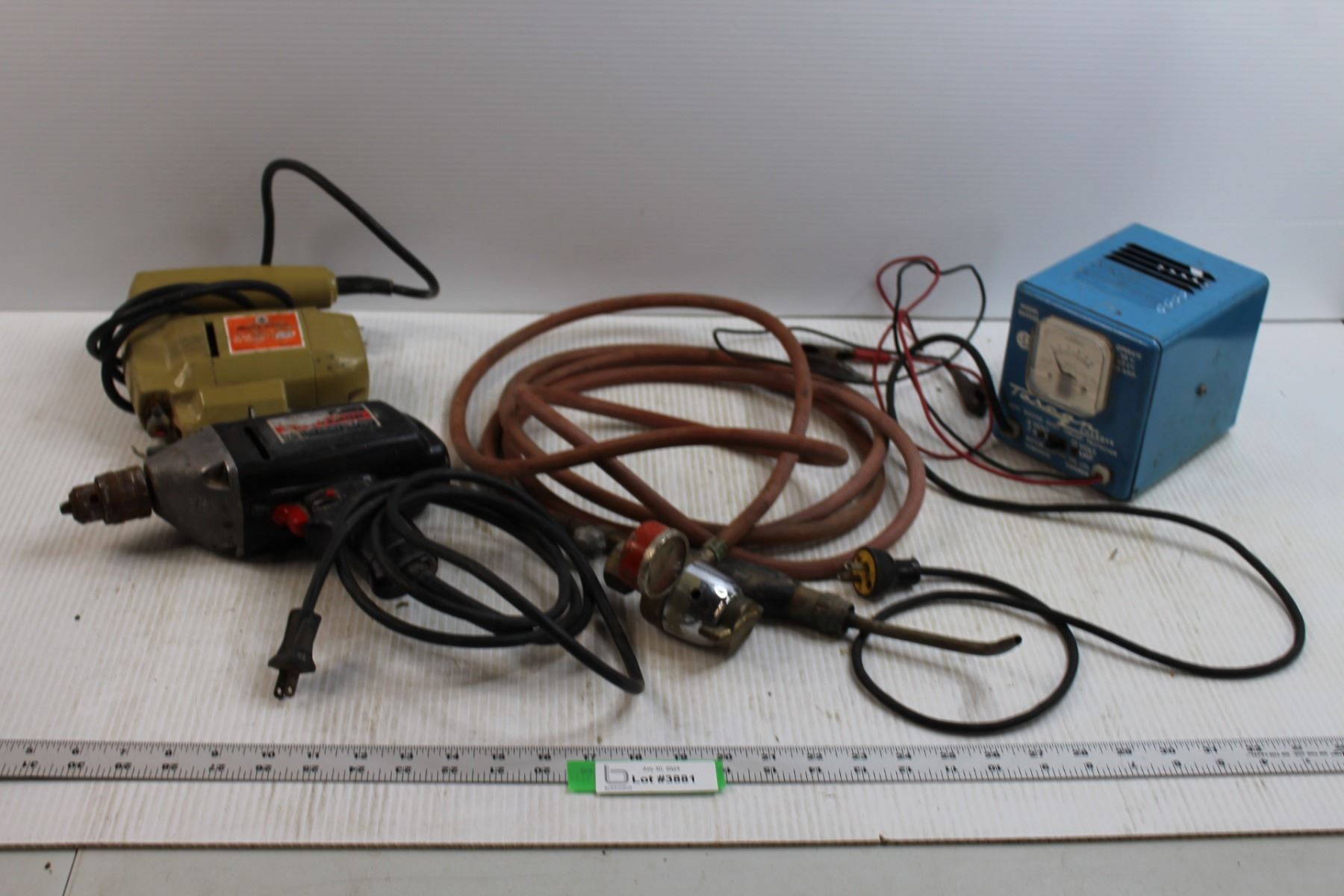 Vintage Tarcan Battery Charger(Untested), Craftsman 3/87" Reversible Drill(working), Black & Decker Jig Saw (working) & Acetylene Regulator Torch Assembly