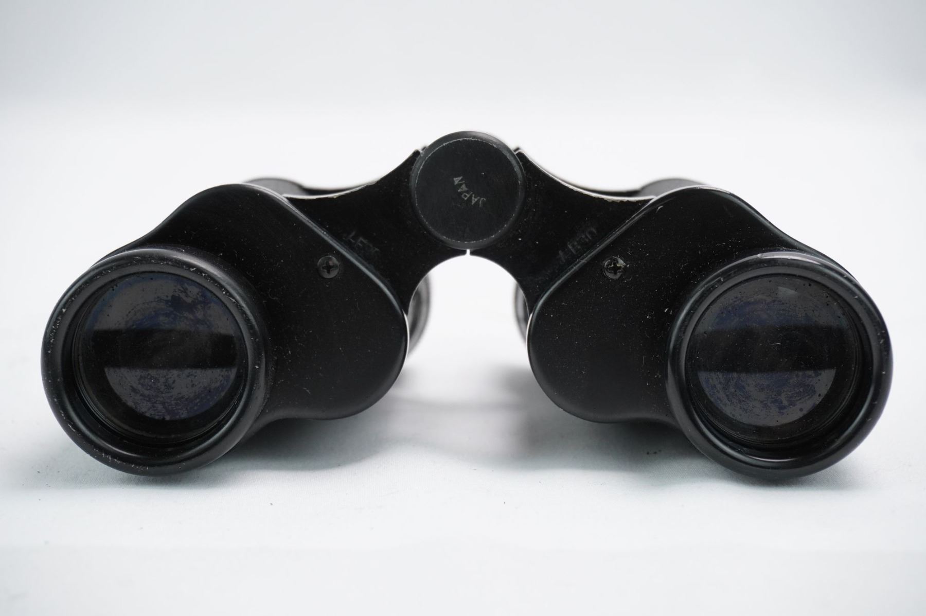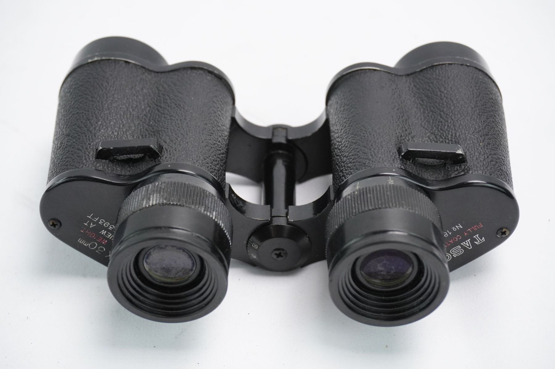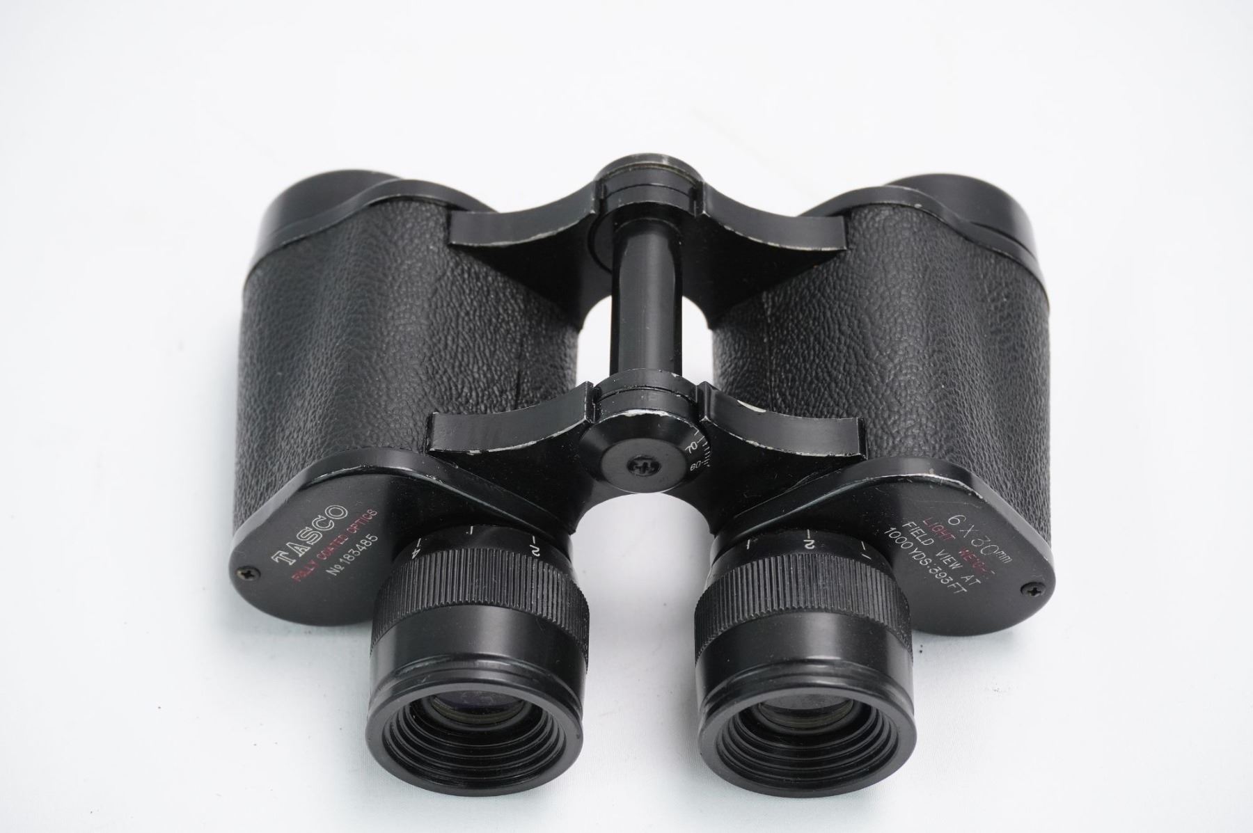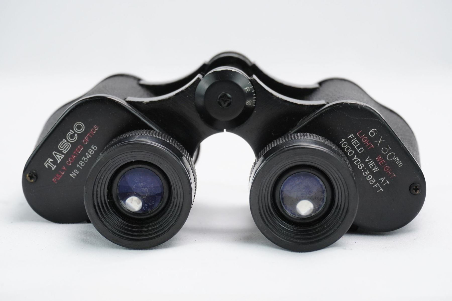 A pair of vintage Tasco Porro prism binoculars featuring a black metal body largely covered by a textured black material, likely leatherette or vulcanite. The binoculars are marked with the brand name TASCO and the specifications 6 X 30mm. Additional inscriptions include LIGHT WEIGHT, FIELD VIEW AT 1000 YDS. 393 FT, and FULLY COATED OPTICS. The serial or model number No 183485 is visible on the left side. The central hinge is marked JAPAN, indicating the country of manufacture. The objective lenses display a visible blue/purple coating.
