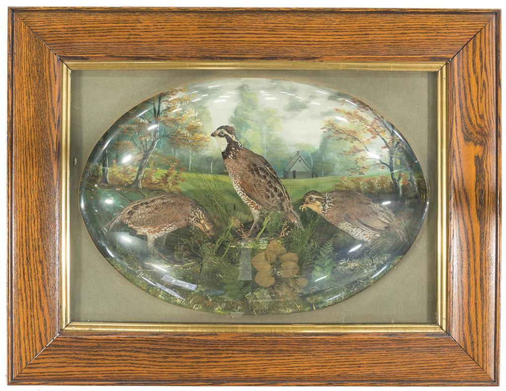 Three taxidermy bobwhite quail with oil canvas background under a glass bubble/dome, frame measures 26" x 34". Consignor states that was done by Schwartz circa 20s-30s. Very fine.