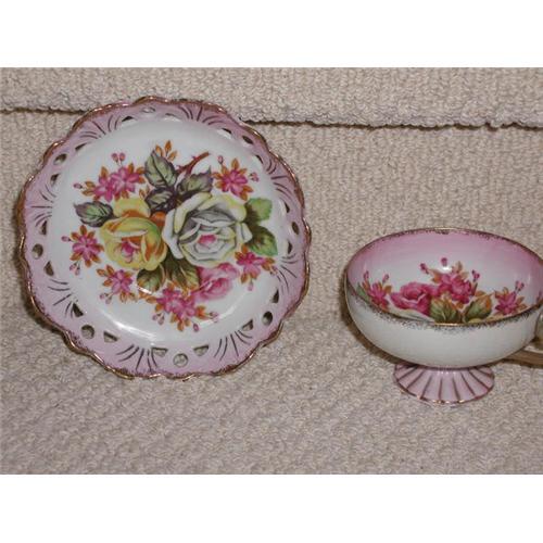 Vintage Teacup and Saucer. Made in Japan. Very elaborate foral work in bottom of saucer and teacup. The saucer is reticulated. Excellent conditon with no chips, cracks, or crazing.