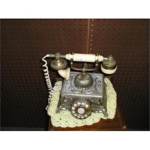 Very Ornate Telephone reproduction of the French telephone. The dialer area has some rust (can be restored). This phone appears to have original hand and wall cords. Wall cord is taped to protect wires. Not tested. Label on bottom states it was made in Korea. Serial #400629 and model is Imperial.