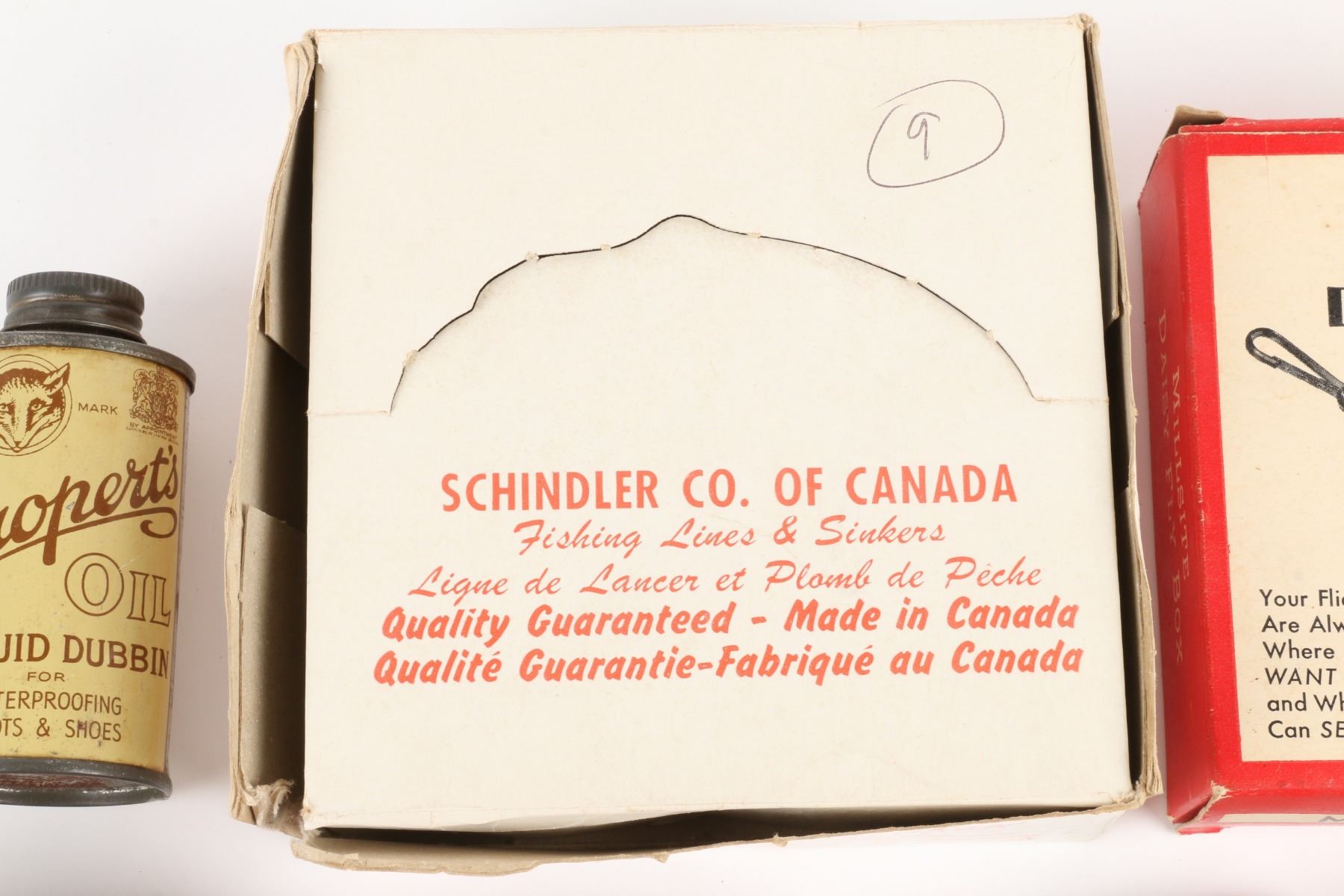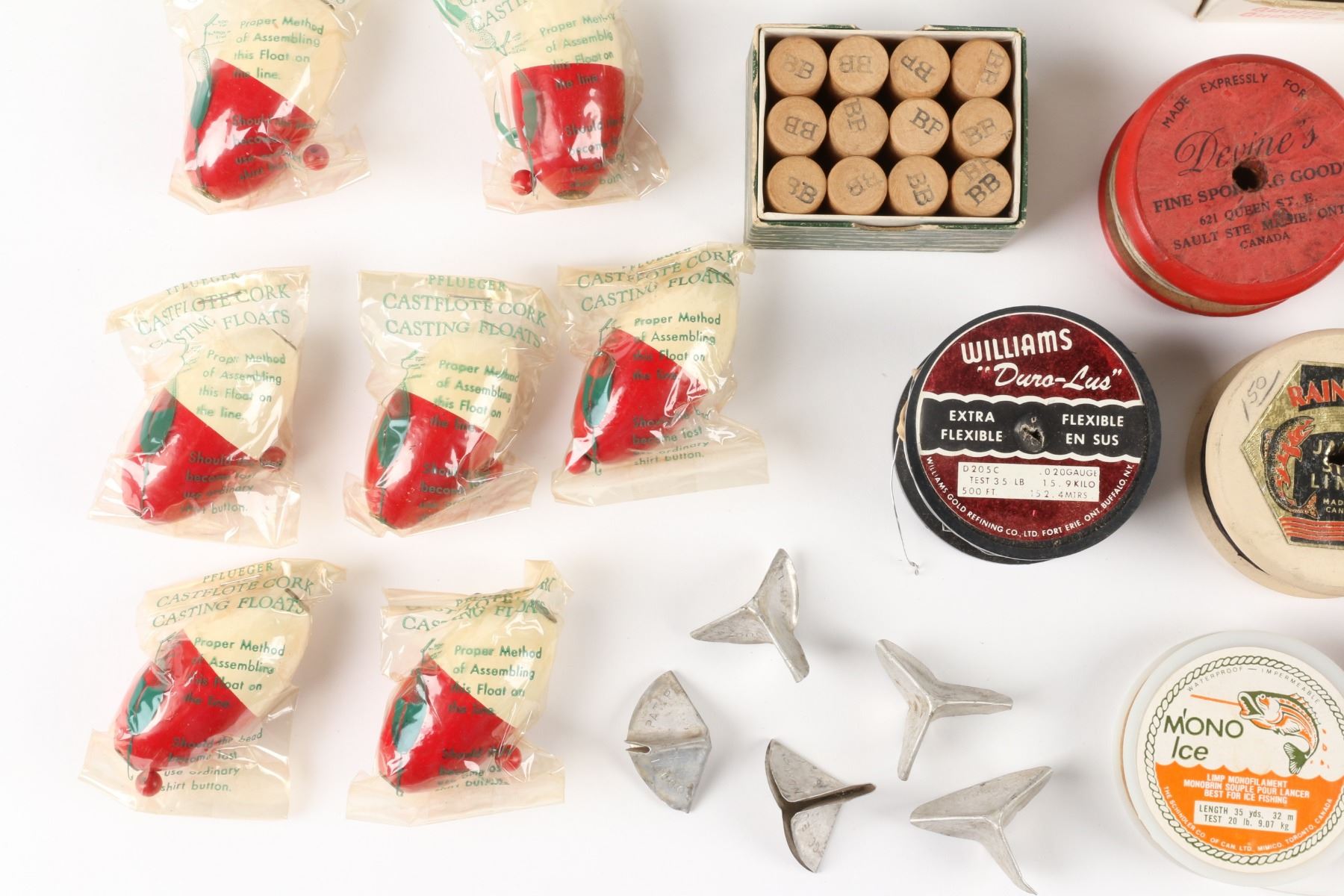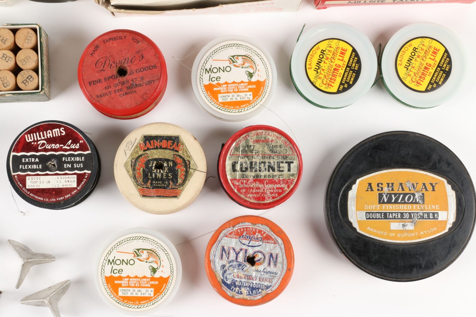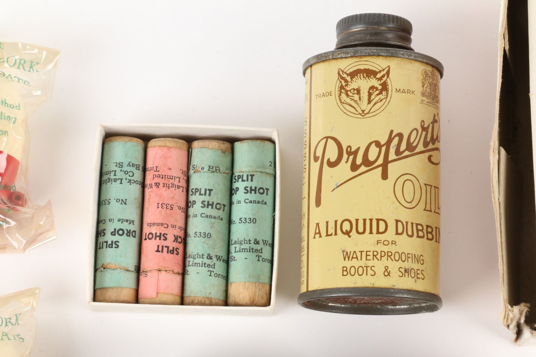 Millsite Fly box, various line spools, split shot, floats, and vintage hook protectors, North America. Material: Mixed. Quantity: . Grade: VG+. 2" - 6" Each Est. $100-125.