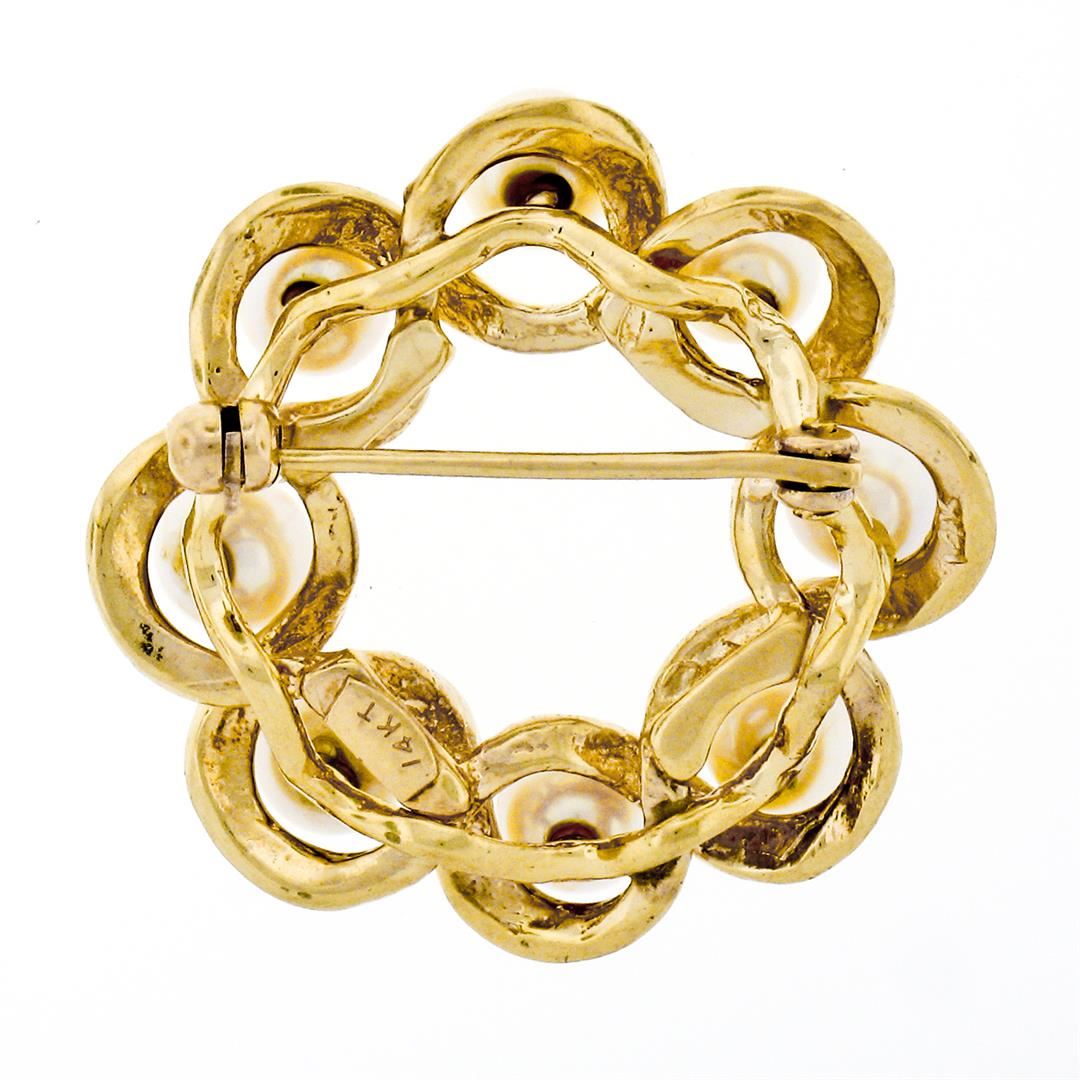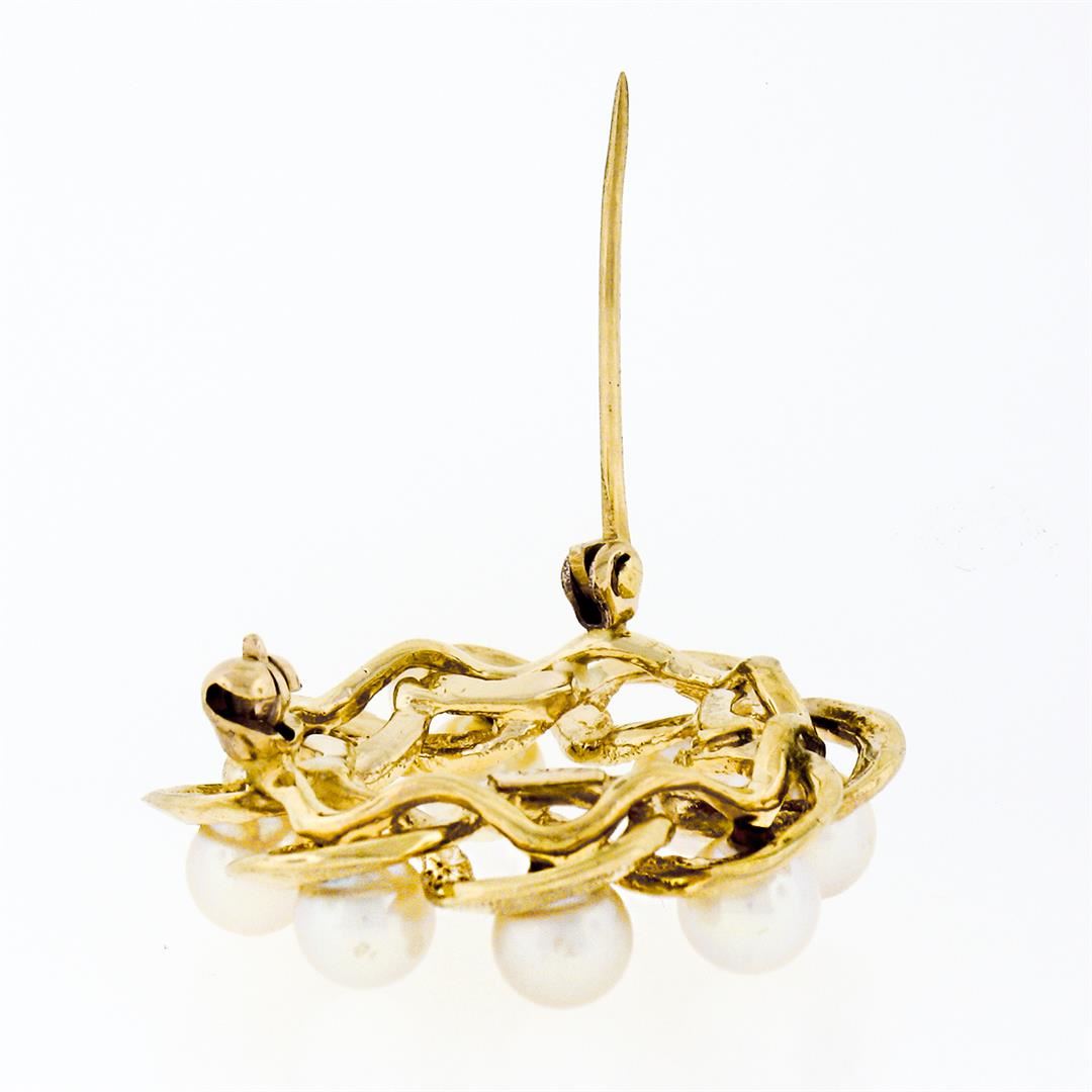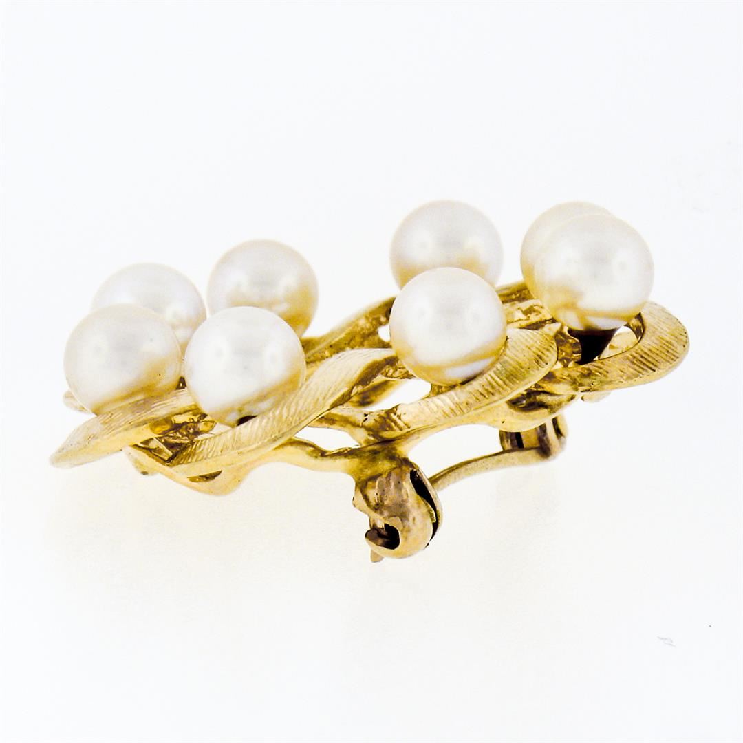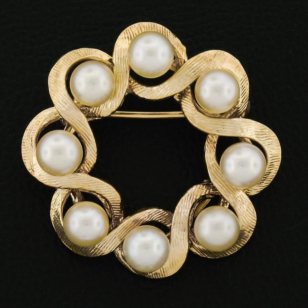 A vintage solid 14k yellow gold wreath pin brooch, with 8 round shape natural cultured pearls (4.8mm). Measures 27.30x27.55mm and weighs a total of 6.62 grams.