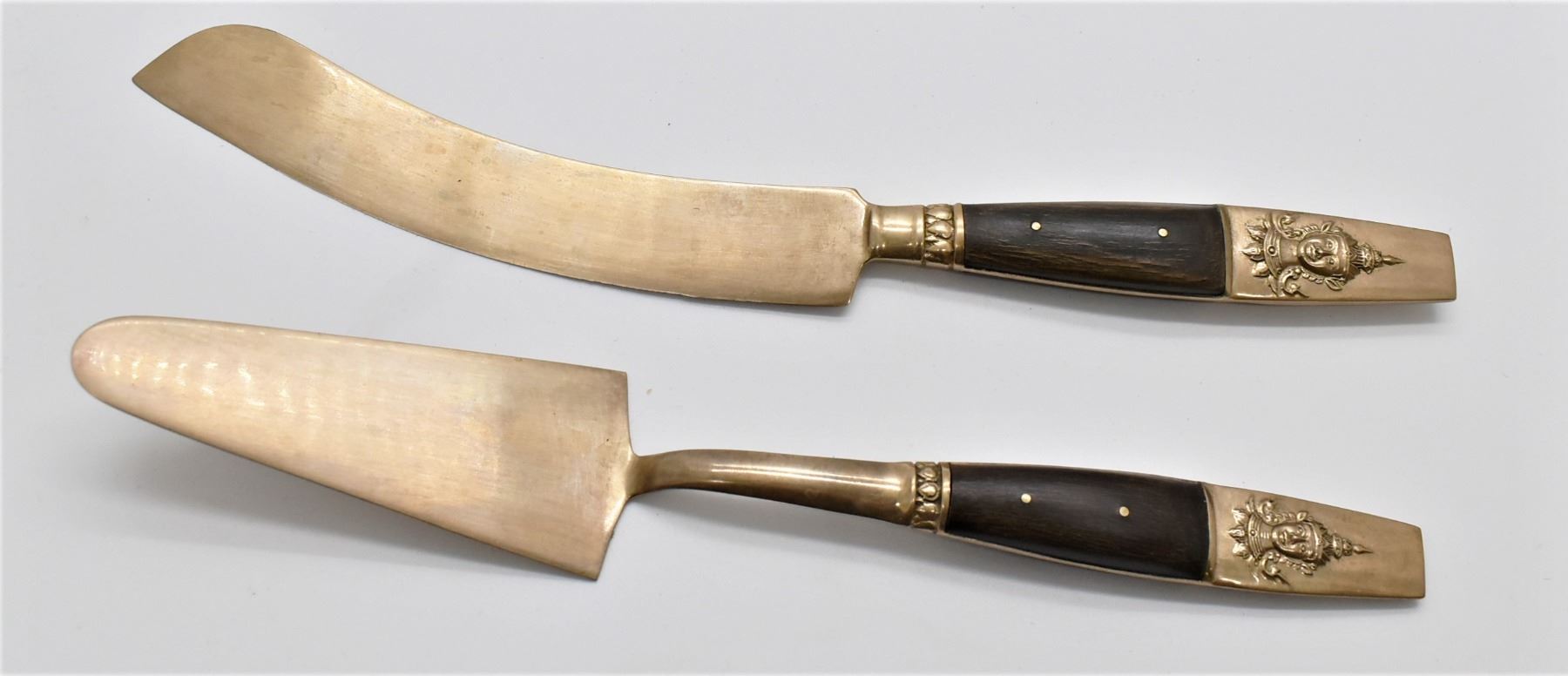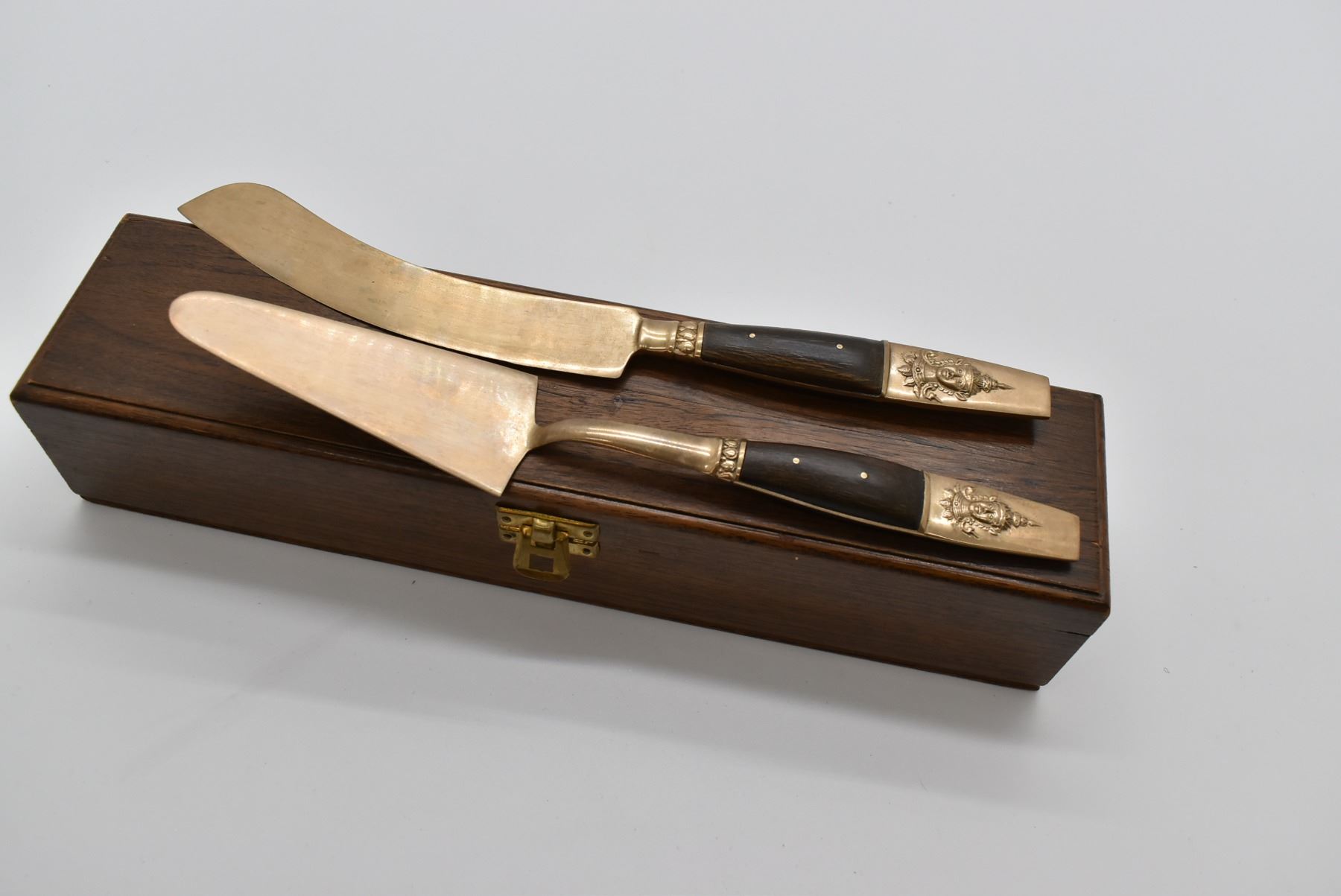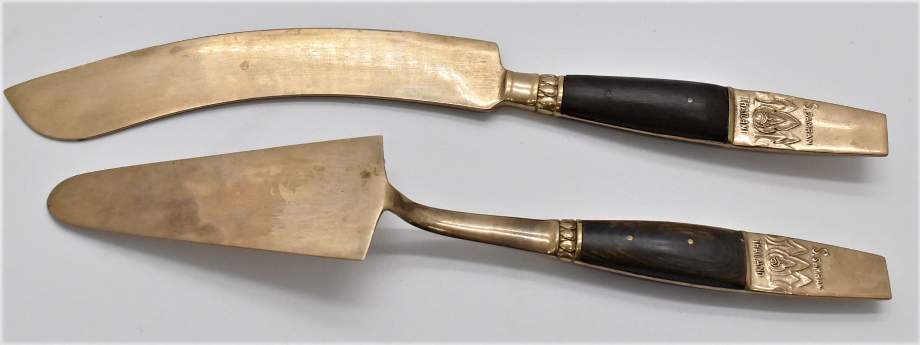 Vintage Thai Bronzeware Cake Knife and Server, comes in hinged wood box, marked S. Samran Thailand, knife measures 11''L, box measures 12.5''L x 2.5''H x 3''W