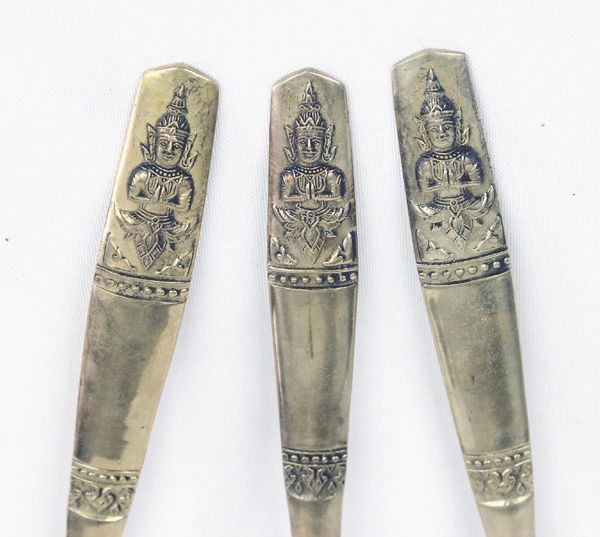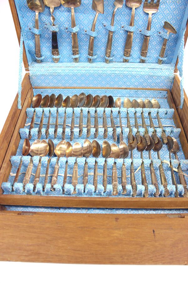 Vintage Thai Flatware Set in Original Case. Probably bronze from Thailand, 1950s Original Wood Box Over 100 including serving pieces. Label says Bangkok. Nicely displayed in a wooden box, lined with blue cloth. The front panel folds down for the spoons. These sets were manufactured and sold from the 1950s through the 1970s. Generally sold to visitors to Thailand through high-end retail and jewelry stores, usually located in or near posh hotels. This set is in good condition with tarnish on most of the pieces - I will leave the proper cleaning method to the experts or the buyer. The box is solid with surface scratches and the felt inside that lines the box is starting to fray. The brass fasteners are intact and close as they were intended. Note: Due to heavy weight, postage may be high. 7''H x 19''w x 17D.