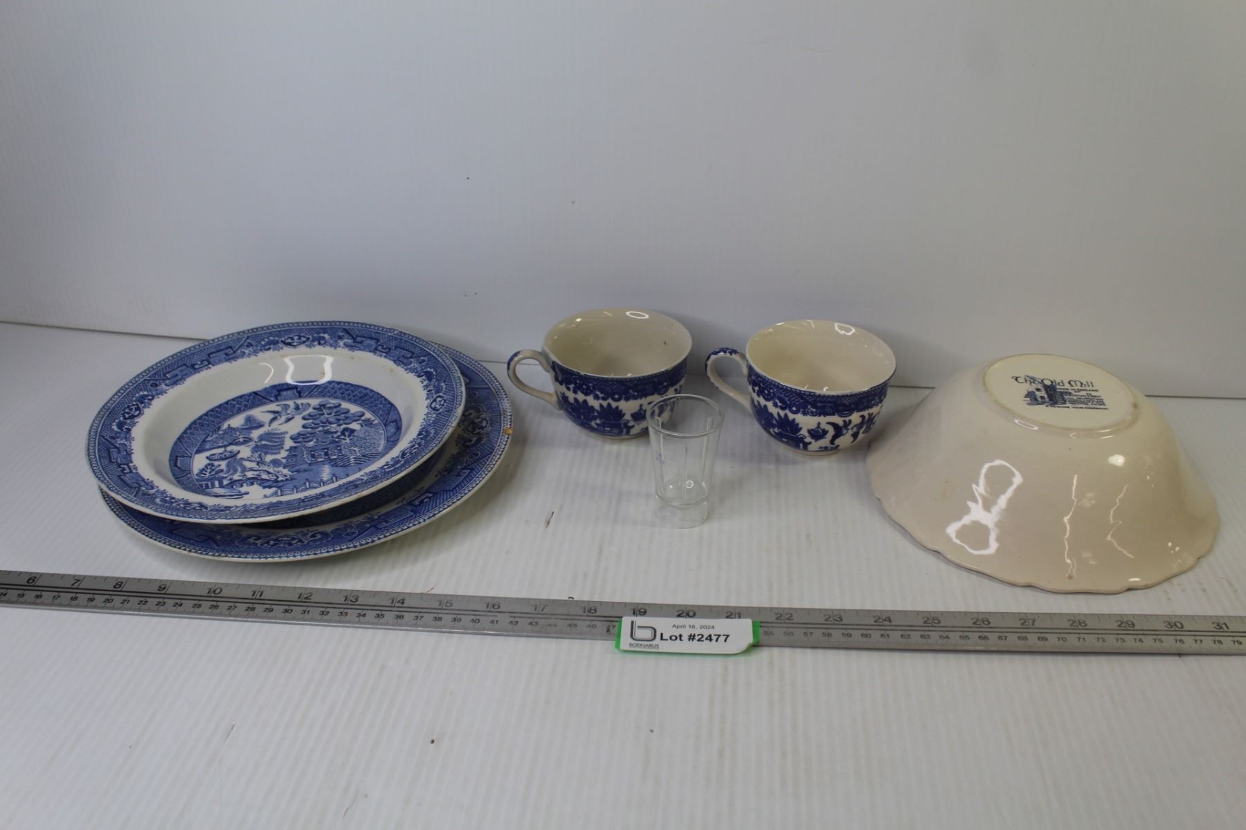 Vintage The Old Mill Bowl - (2) Cups (Made in China) - Plates (Made in England - has chip)