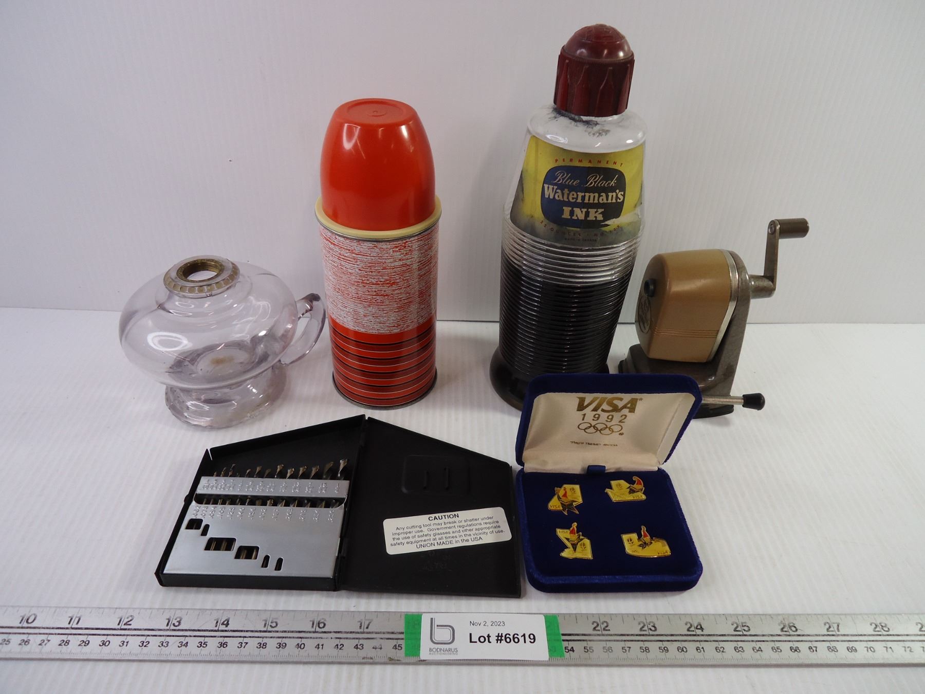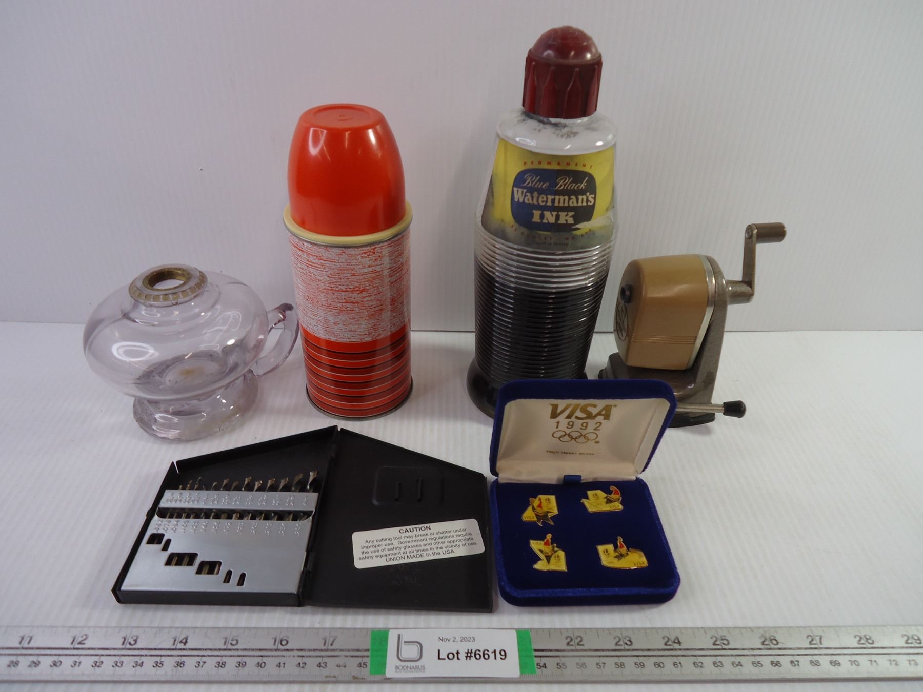 Vintage Thermos and Pencil Sharpener, Ink Bottle(cannot ship)Oil Lamp Base, Pin Set and Drill Bit Set