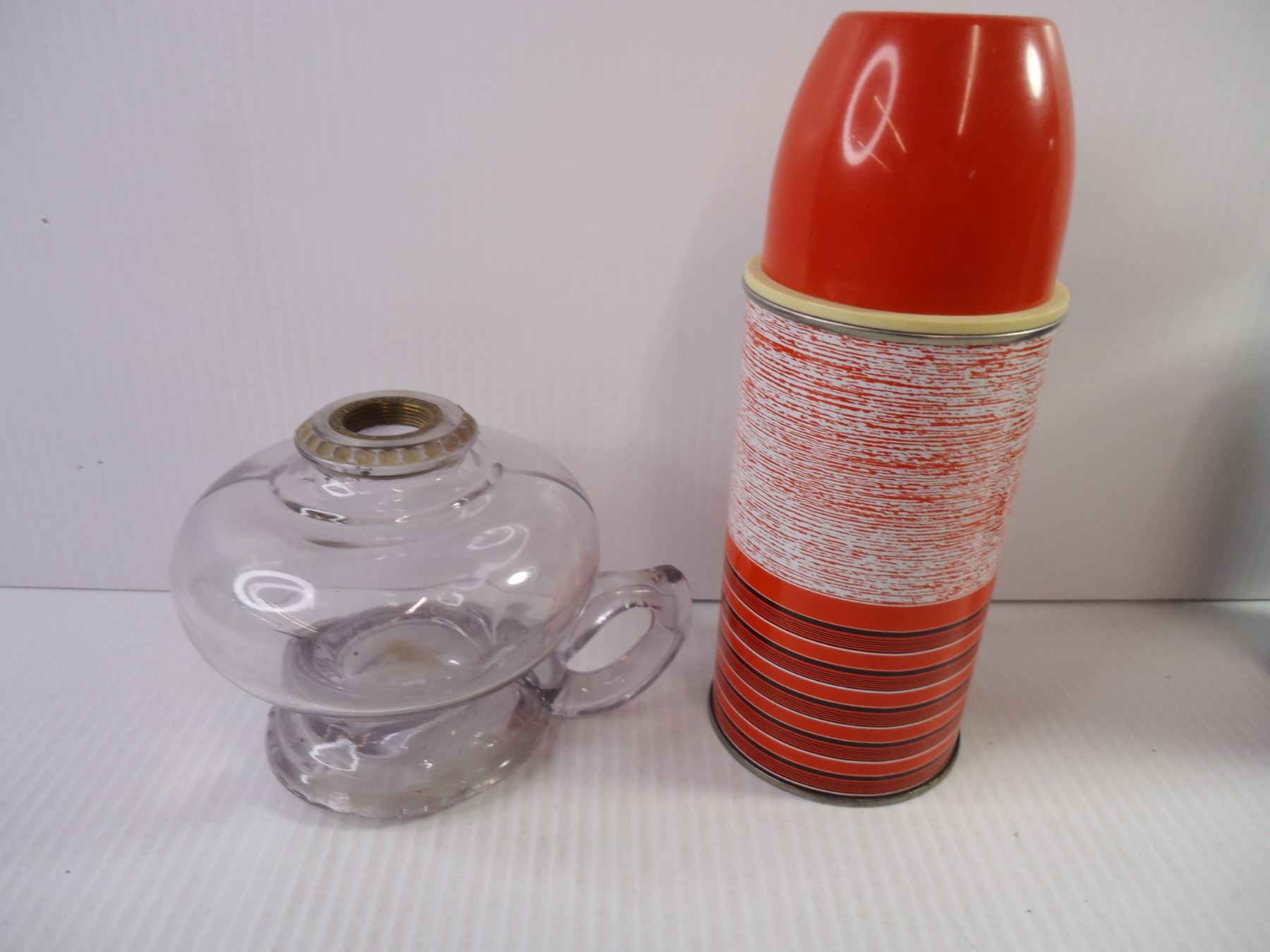 Vintage Thermos and Pencil Sharpener, Ink Bottle(cannot ship)Oil Lamp Base, Pin Set and Drill Bit Se