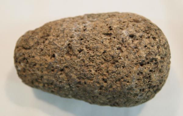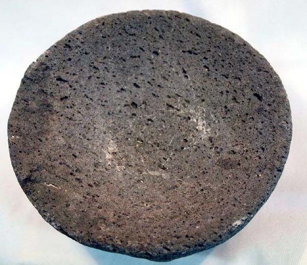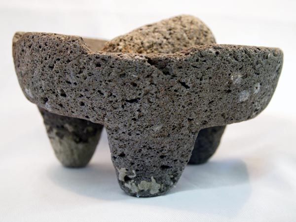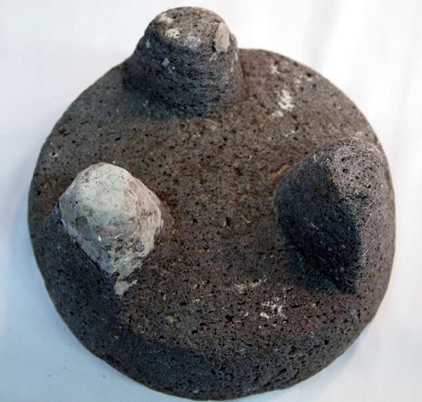 Vintage Three Legged Grinder With grinding stone. Measures approx. 3 1/2''h x 7 1/2''W. Does have some chips off edge.