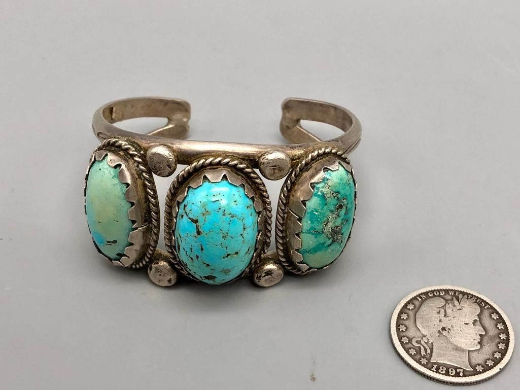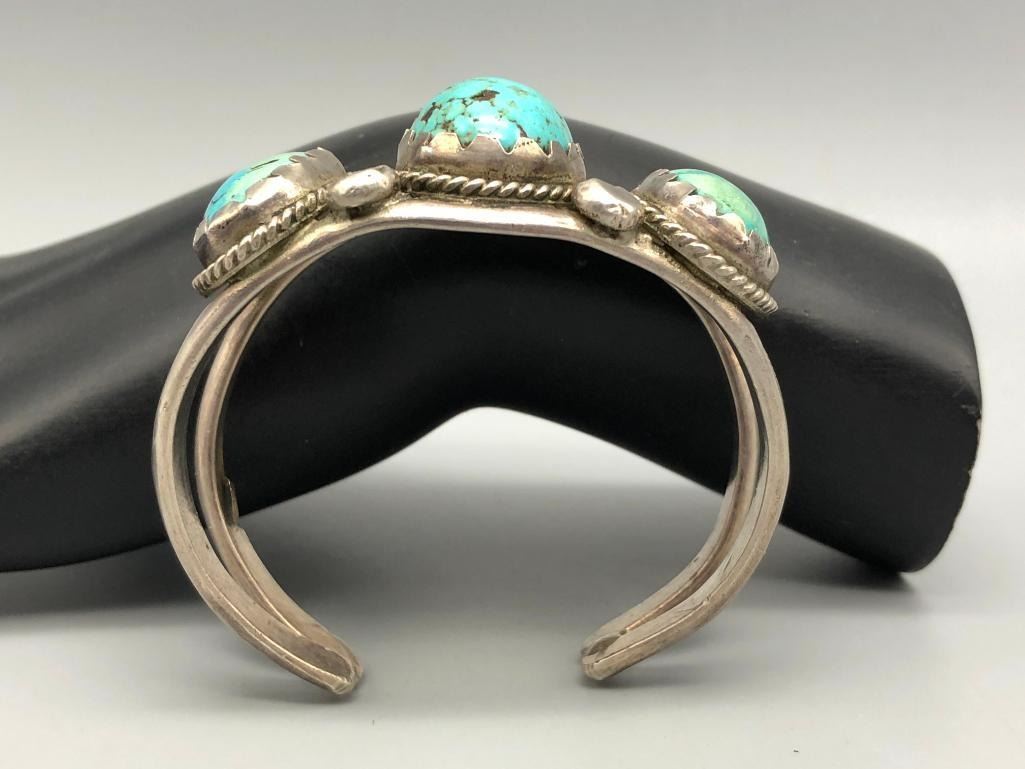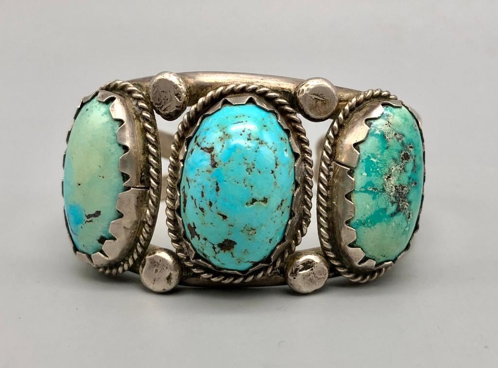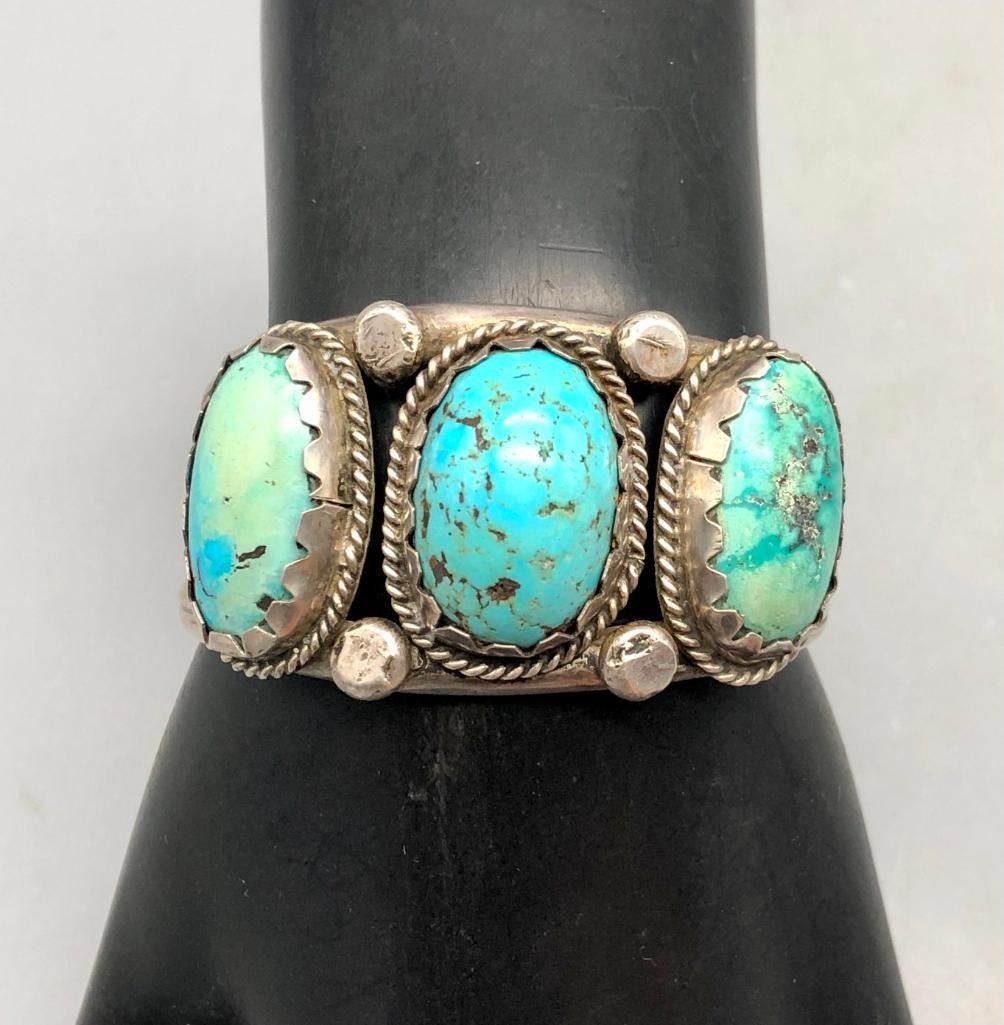 For sale in this lot is a vintage three stone cuff bracelet. This is a fun bracelet set with three brightly hued turquoise cabochons that have nice color variations due to their age. The stones are in handmade bezels and accented with four large silver dots in between each setting. It is on a two wire cuff and is made from sterling silver. MAKER: Unmarked. APPROX AGE: Vintage. SIZE: Inside circumference measures 5-1/2 inches long. Opening is an additional 7/8 inches, fitting a 6-3/8 inch wrist. Width is 1-1/4 inches. Weighs 59.3 grams CONDITION: Good for its age, normal wear expected. Please look closely at the pictures as they are an important part of our description and are hereby incorporated into the description, specifically with regards to condition. SHIPPING: There will be a $5 handling / packaging fee for shipping this lot. The actual cost of postage will be added on top of that. BUY IT NOW: If you would like to buy this item now, without waiting for the auction day to bid on it, we do offer this option (which is available up to 48 hours before the actual auction starts). The “Buy it Now†price is the high estimate of this lot (plus applicable fees and the Buyer's premium is discounted to 10% when using the Buy it Now option). If you would like to exercise this option, you must contact us by email (or phone as long as you talk to someone live). Reference this lot number and your intention to "Buy it Now."